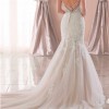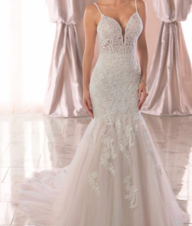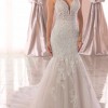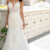 Stella York 6793 is a lovely tulle gown decorated with intricate lace + beading! A plunging V neckline + voluminous skirt add the finishing touches to this look. This gown is blush and ivory.
