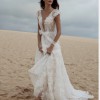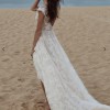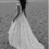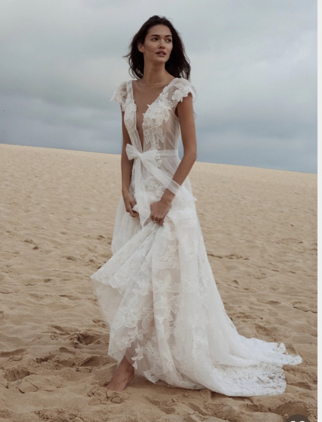 Angel is an ethereal bridal gown. Made from a beautiful floral embroidered, glitter tulle, the gown slightly shimmers when it catches the light. The bodice features cap sleeves and the hand-cut floral motifs are placed thoughtfully to highlight the deep neckline which has an illusion tulle.