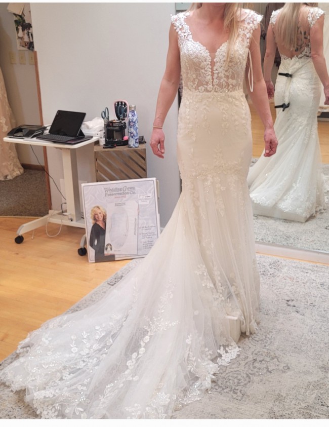 I bought 2 wedding dresses, this Kelly Faetanini is new with tags. It was a size 10 and I had it altered to be between a 6-7. Tags still attached, it was $2,268.00. Beautiful back, tons of beautiful beading