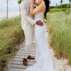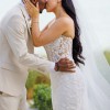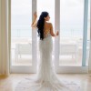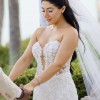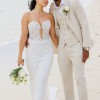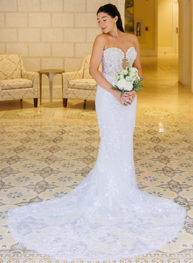 This stunning strapless mermaid wedding gown was worn for my oceanfront wedding, where its intricate, dimensional beaded vines and sequined lace shimmered beautifully in the sunlight. The translucent Chantilly lace adds an ethereal touch, while the expertly crafted mermaid silhouette enhances and flatters the female form.