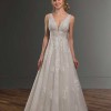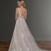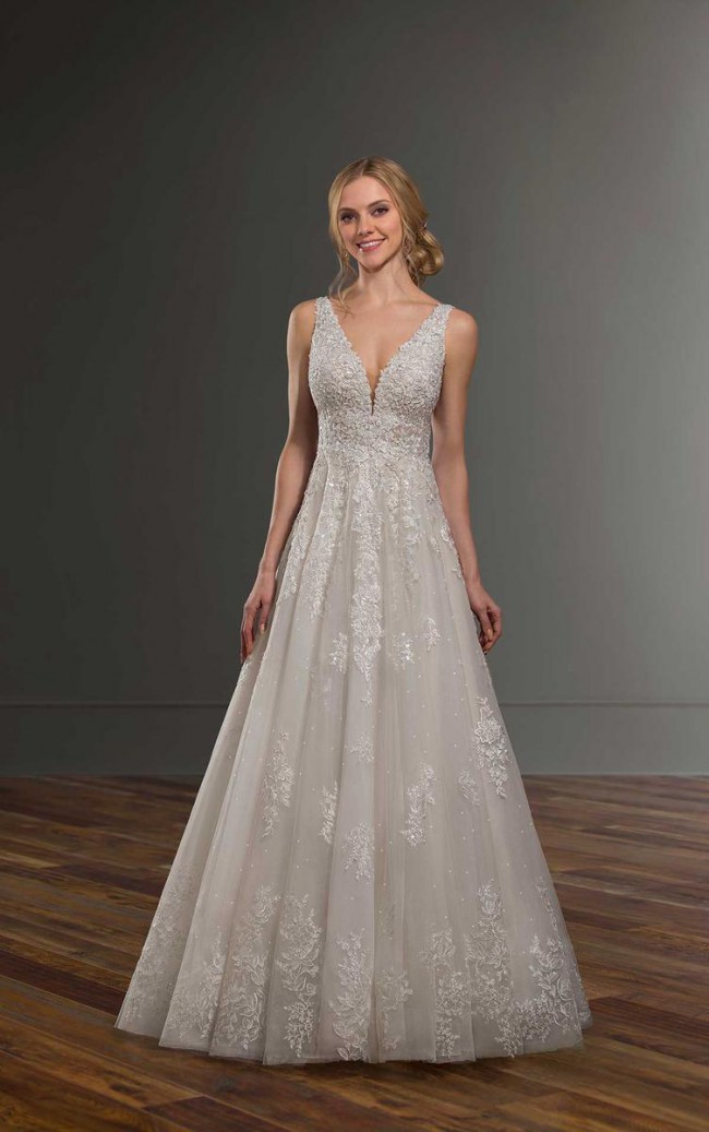 A sheer A-line wedding dress with subtle sparkle, this Martina Liana gown is both glamorous and romantic. The plunging V-neckline of this style is adorned with heavy beadwork, adding to the sexy and glamorous vibe and creating dimension. Three-dimensional flowers, embellished with bugle and diamante beads, have been hand-placed on the A-line skirt of this gown, creating a rich look to an otherwise soft style. A plunging V accentuates the back of this gown, and a long, skirt with a finished hem completes the look. The back of this A-line wedding dress with subtle sparkle zips up beneath crystal buttons.
