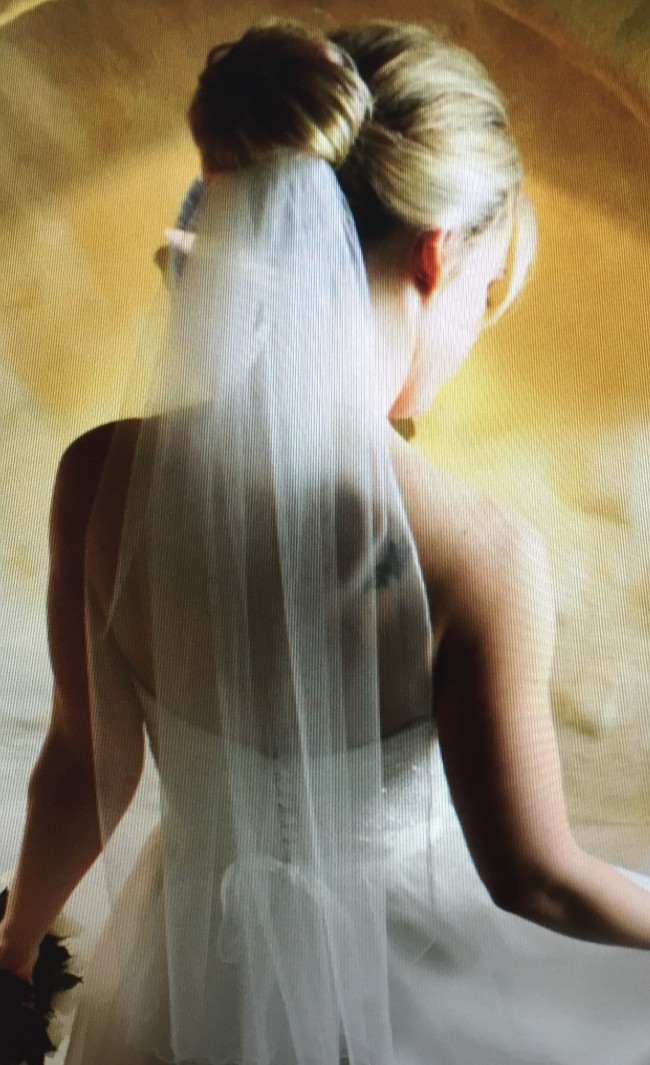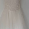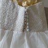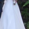 It has a stunning sequin, sweet heart neckline bodice with silk buttons and a velvet ribbon around this waist. The skirt features a silk slip under layers of tulle and organza. I had my sweetheart Neckline custom made a bit higher for modesty on the day . I didn’t want a low busty neckline.