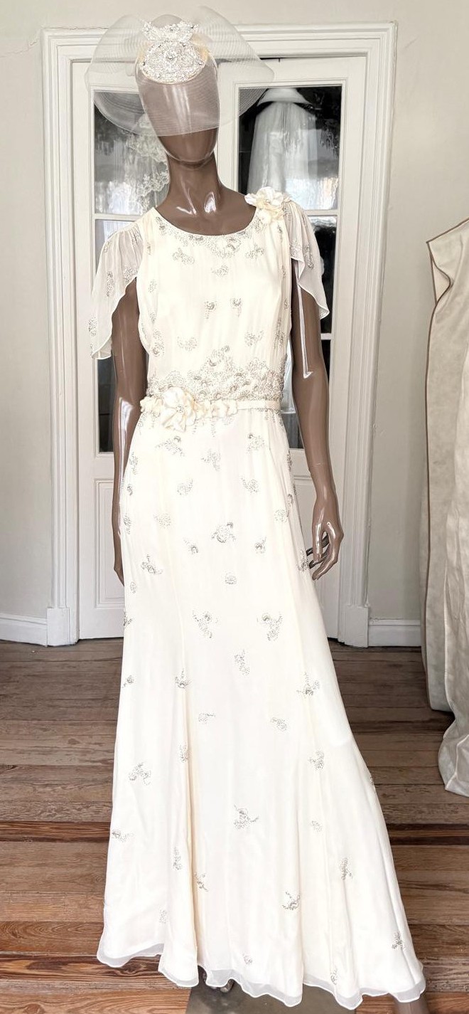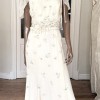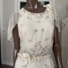 This Hibiscus gown by acclaimed designer Jenny Packham is a breathtaking embodiment of elegance and romance. The ivory chiffon fabric gently drapes over your figure, creating a stunning sheath silhouette that flatters in all the right places. The graceful boat neckline frames the face beautifully, while the high back adds an extra touch of sophistication.
