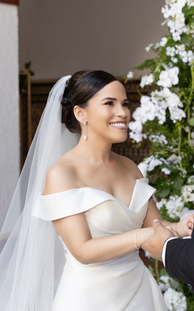 This enchanting ballgown by Sophia Tolli embodies the fairy tale dream I had for my wedding day. With its stunning off-the-shoulder neckline, it highlights the shoulders beautifully while providing a romantic and timeless elegance. The flowing floor-length design allowed me to twirl with joy, feeling like the queen I always imagined I would be.