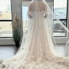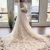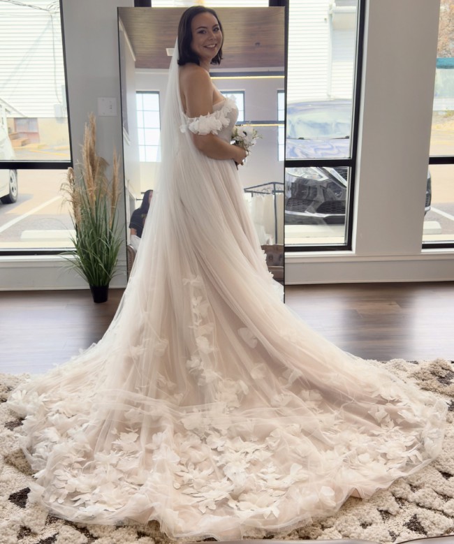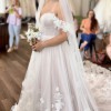 Tulle Ballgown Wedding Dress with 3D Florals and Off-the-Shoulder Straps. Fabrics include Lace, Tulle and Royal Organza.