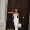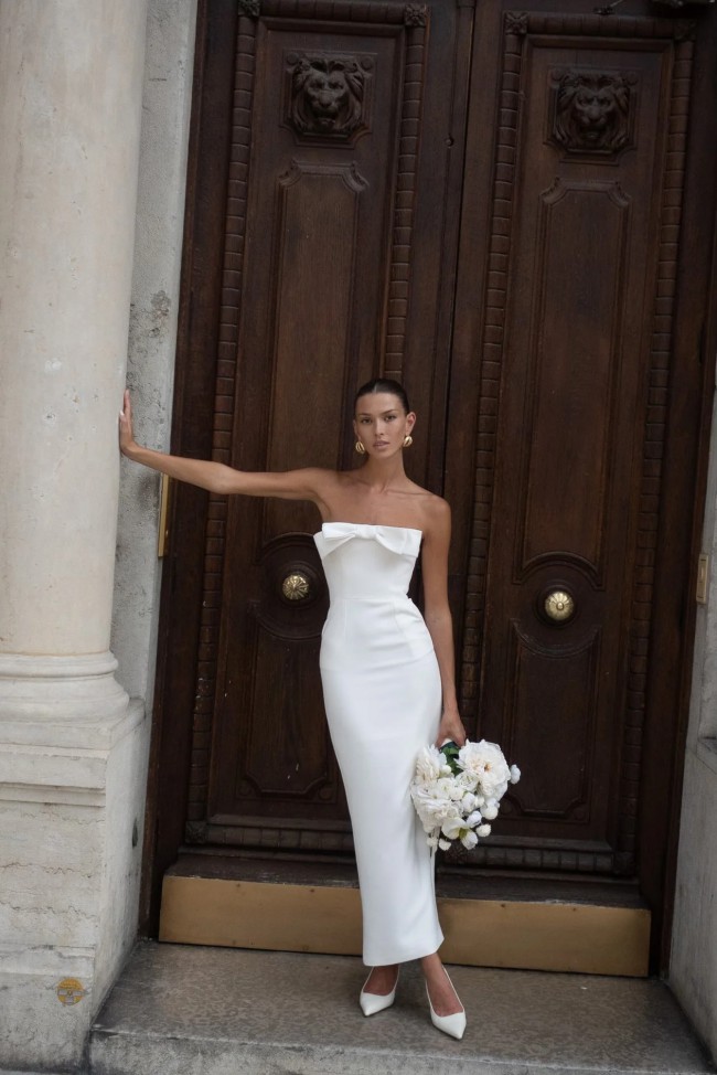This elegant white dress is crafted from soft crepe fabric, providing a gentle drape and comfortable fit. Its standout feature is the stylish bow accent, which adds a touch of sophistication to the overall design. Practicality meets style with conveniently placed pockets, making it perfect for both an engagement dress or wedding dress.