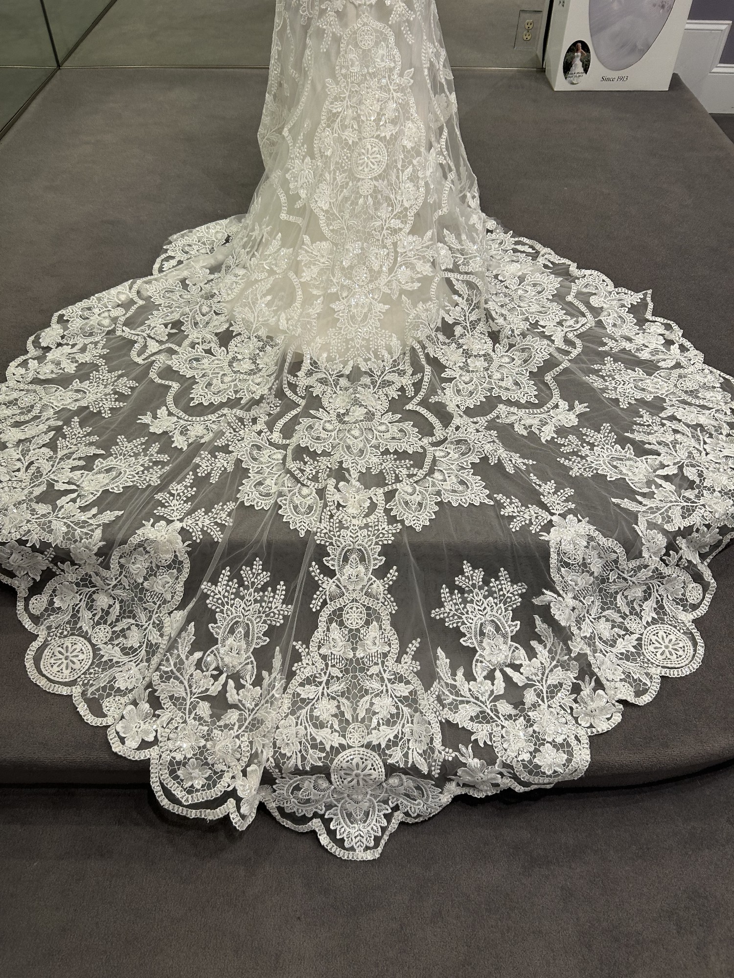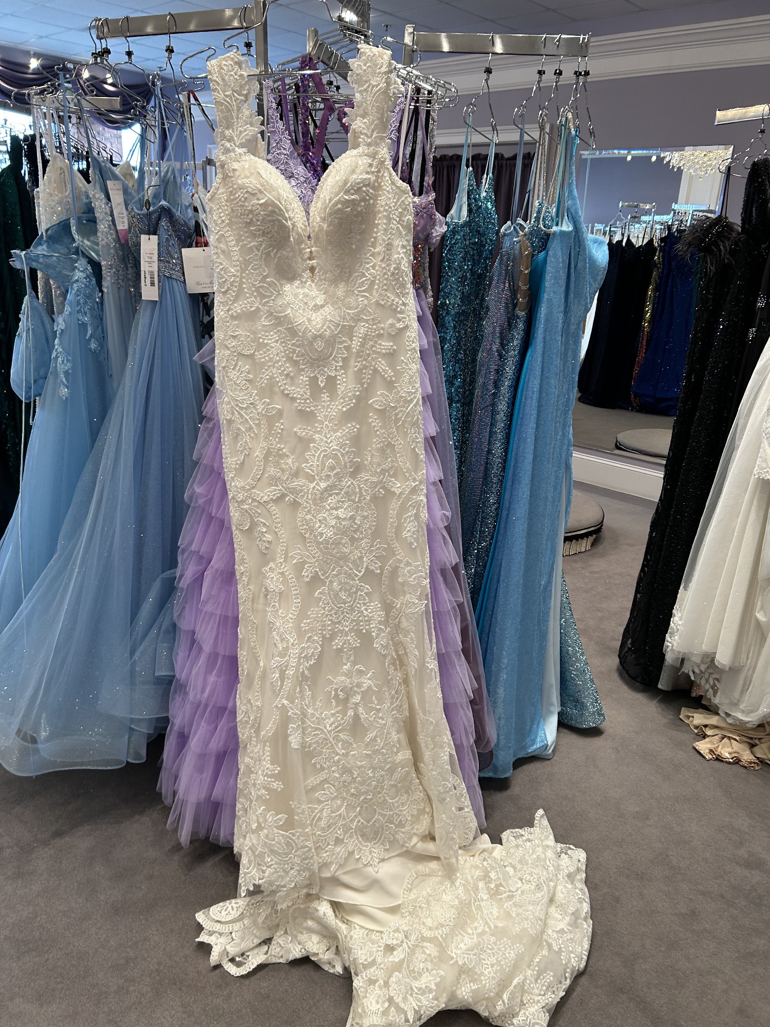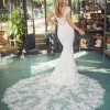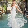 A portrait of timeless beauty, Justine Style 2485 by Casablanca Bridal is a vision of romanticism and femininity. Crafted from exquisite stretch chiffon, this figure-loving fit and flare silhouette features a plunging neckline and wide straps that frame a low-cut laced back. Carefully tailored to flatter while embracing your every curve, Justine's eye-catching overlace with sequins extend into a classily elegant 95" train.