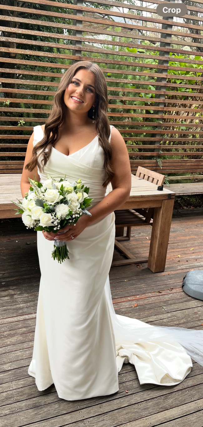 Label size 18 however dress has been taken in at bust, waist and through skirt to size down to a size 14/16 (was 8 weeks pregnant at time of wedding). Shoulder straps shortened slightly so they don’t fall off shoulders.