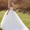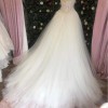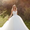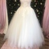 Strapless corded lace over allover lace and tulle bridal ball gown features heavily beaded semi-sheer corded lace over allover lace corset sweetheart bodice, covered buttons along zipper back, full gathered tulle skirt with beaded corded lace appliques at the waist, chapel train. Separate bodice lining included.