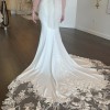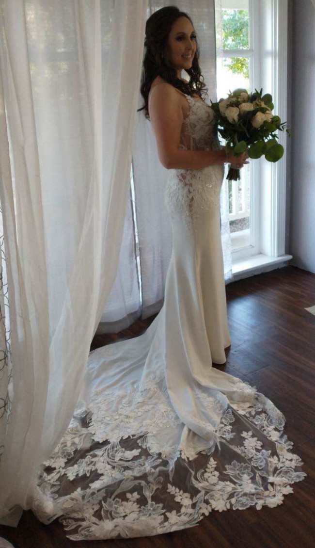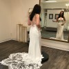 Pearl-D wedding dress from Enzoani is the perfect embodiment of elegance and modern romance. Crafted in a stunning ivory crepe fabric, its trumpet silhouette hugs your curves in all the right places, creating a breathtaking hourglass figure as you walk down the aisle. The V-neckline and backless design add a touch of allure, while the delicate spaghetti straps seamlessly enhance the overall charm of the gown.