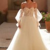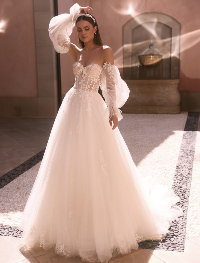 neckline and exquisite lace and bodice accentuate your feminine silhouette and lend the dress a timeless romance. Long lace sleeves create an elegant, sexy look, while the lavish duchesse cut with tulle and lace creates a regal aura. This dress is perfect if you want to appear both romantic and seductive