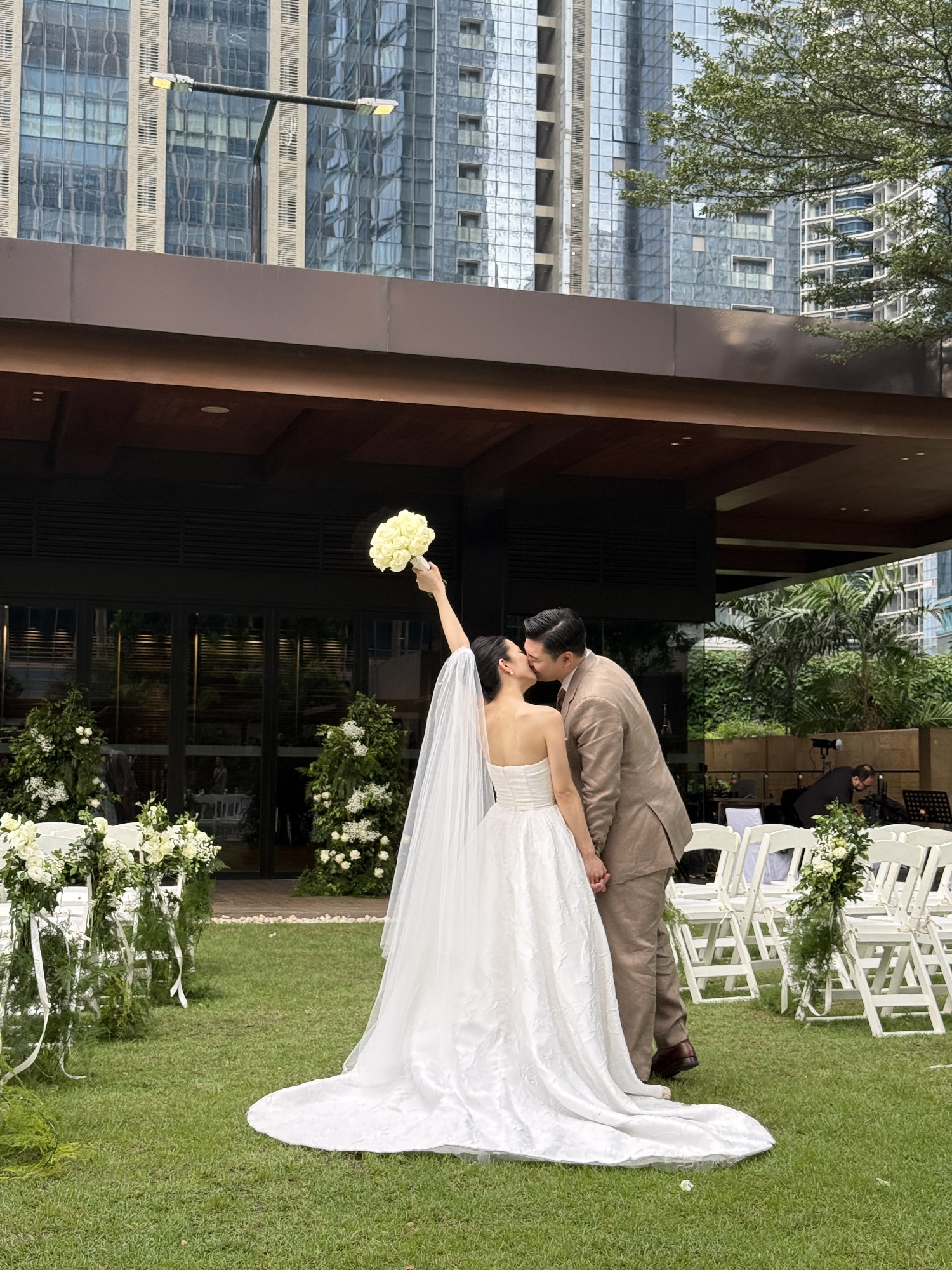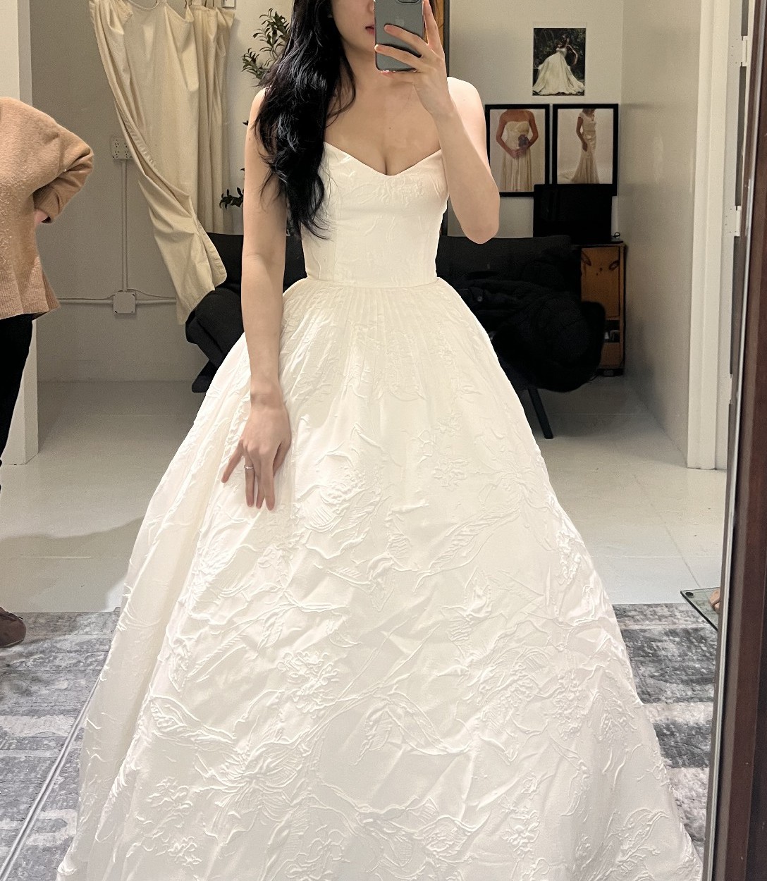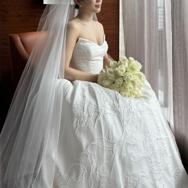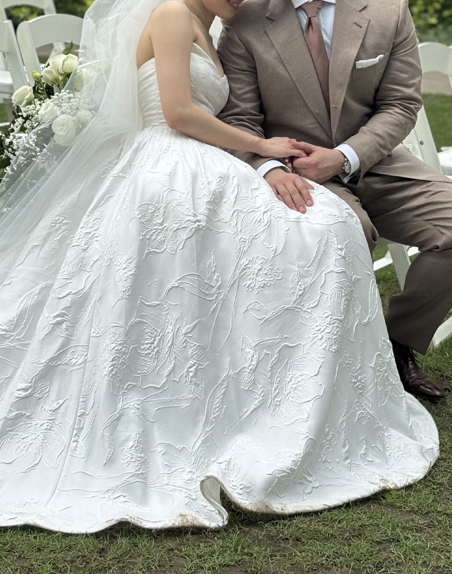 It’s a beautiful dress. I bought it secondhand and made a few alterations. I changed the neckline and made the skirt more voluminous. The alteration cost $1000, but it became the perfect dream dress for me. Above all, the floral pattern on the dress captivated me, and I was so happy to wear it on my wedding day. It’s such an elegant and classic dress. The dry cleaning has also been completed.