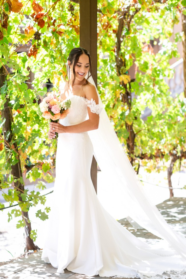 Preserved ivory Sophia Tolli Millee gown with detachable straps and wrist loop. Wrist loop can be removed if you prefer a bustle (the little red chili has been removed).