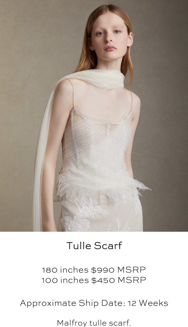 100 inch tulle scarf from Danielle Frankel. I bought this to wear as a neck scarf, but I ended up being so wrapped up on the day of that I forgot to wear it! So it's only been tried on in alterations and otherwise new