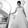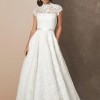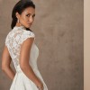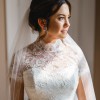 This stunning Caroline Castigliano Madeira bridal gown is a fabulous, refined all-over lace creation. The gown features a classic Castigliano corset, low at the back, cinching in the waist and lifting the bust with 16 bones holding the circumference of the body. A cap sleeve shrug is moulded over the corset and continues into a standing collar and flows into a full lace skirt.