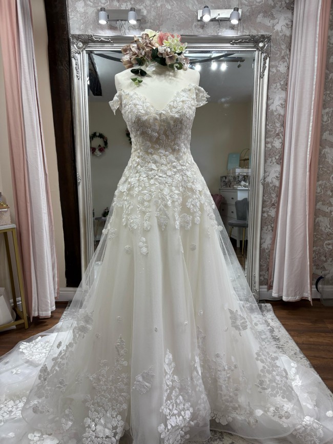 Ex-sample Gaia Bridal wedding dress Jasmine in Ivory. In great condition, lace detail skirt and bodice, sequin underlay on skirt, off shoulder straps. No alterations