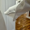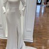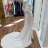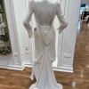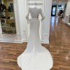This elegant white gown features 3/4 pointed sleeves with buttons all the way down the back and a sophisticated drape. There is a bustle already in the dress which will forego the need for that alteration. There is a 72” train.
