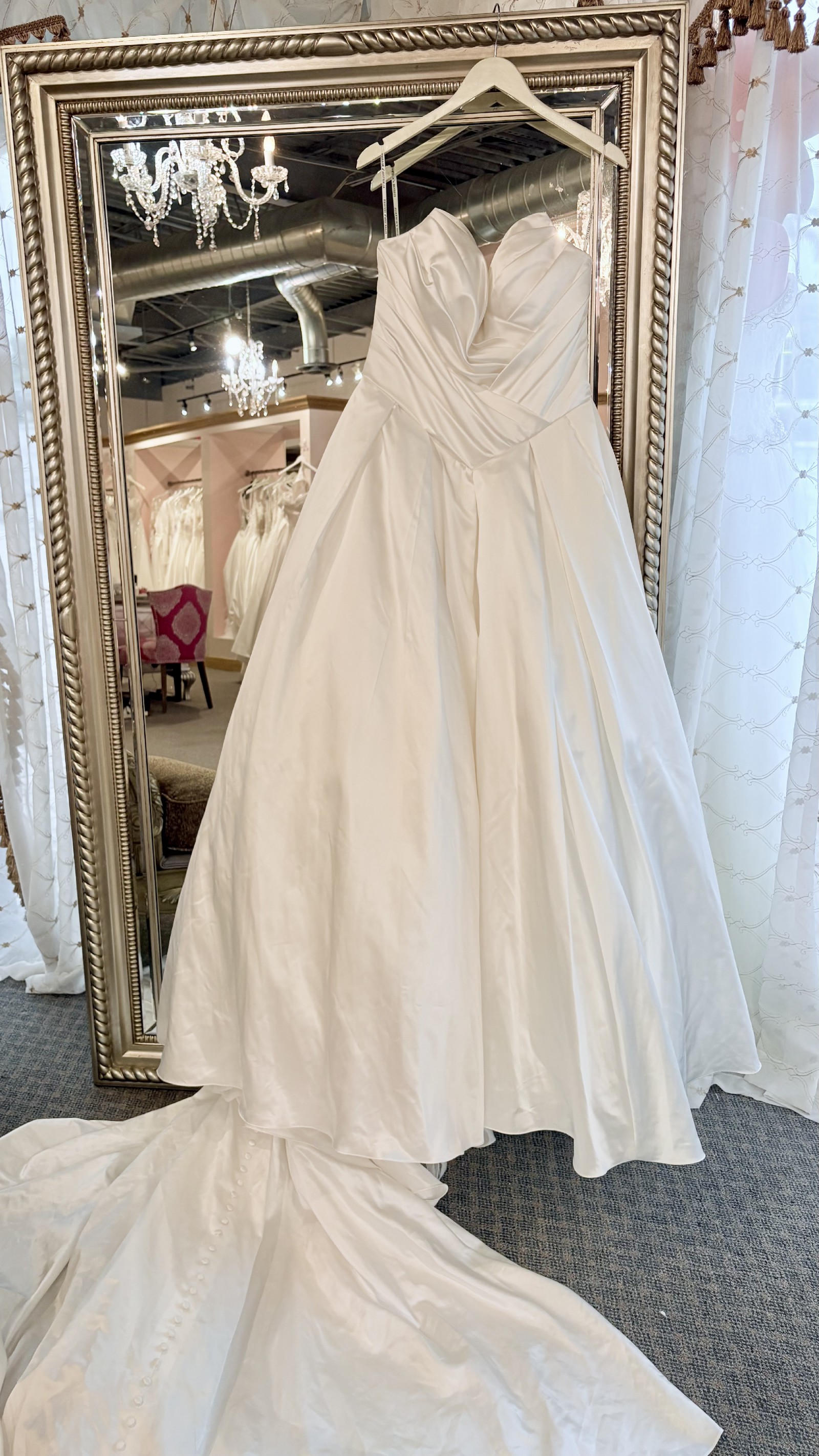 *Reduced price to sell quickly!* Brand new dress, not altered. Beautiful dress never touched, amazing deal for any height bride. Modern and romantic, Style D4109 is a glamorous satin princess wedding dress ready for the runway or the aisle. An intricately draped bodice features a flattering sweetheart neckline to accentuate the impeccably tailored bodice. In the back, the Basque waist and an oversized detachable bow adds a contemporary fashion-forward touch