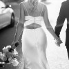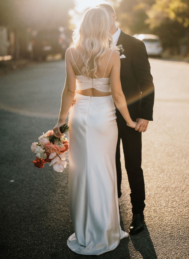 There have been slight adjustments to bias cut top and hem. Has small train on skirt.