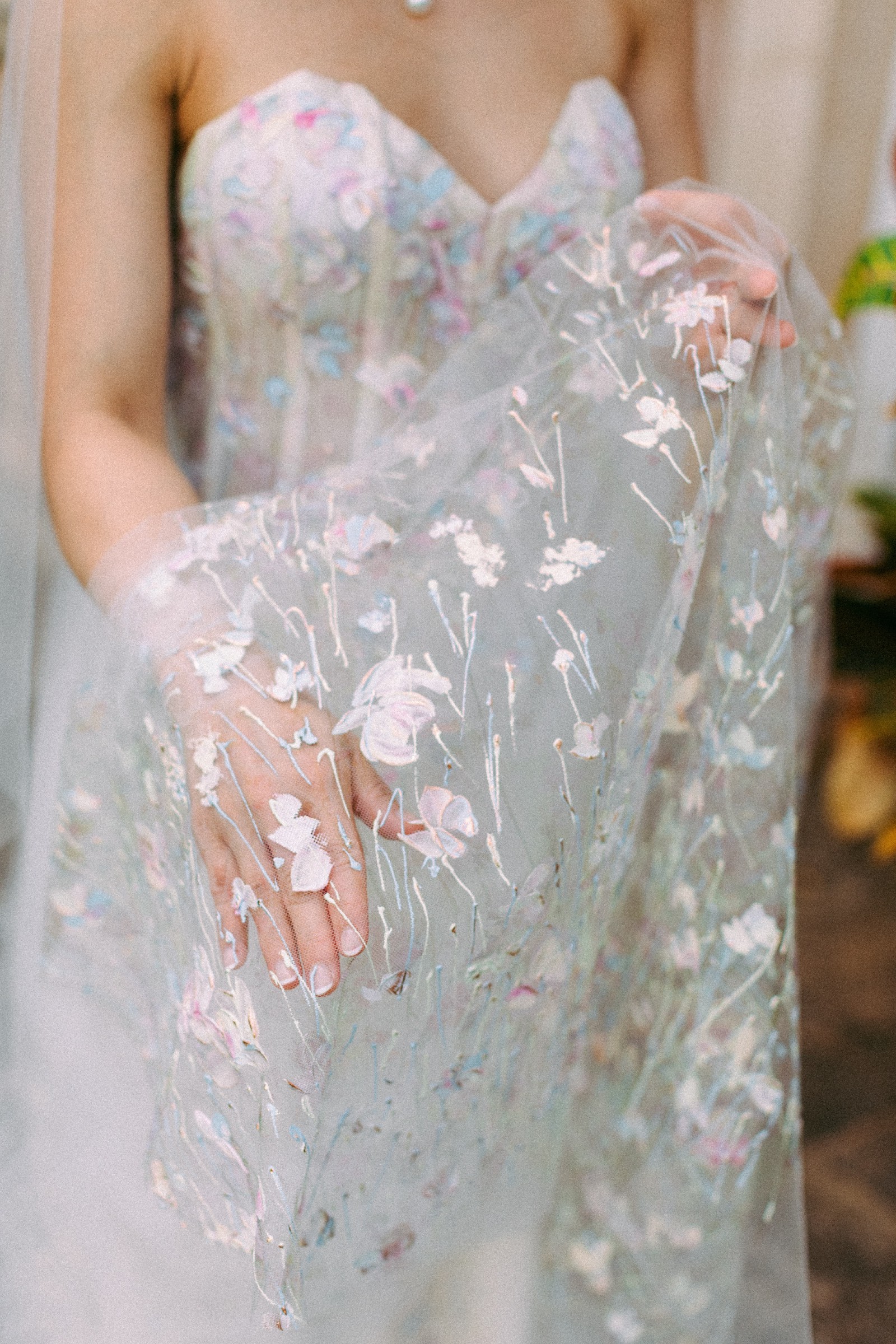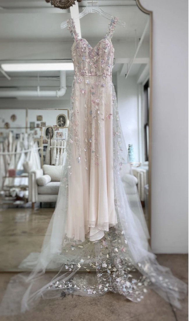 This is a customized, handpainted Carol Hannah "Monet" gown in champagne instead of the original blue. This bias cut a-line gown was made in the NYC Garment district and uses Italian tulle over iridescent silk chiffon. This gown is very light weight and effortless to wear. It was a magical experience wearing this wedding dress, and I hope that the next bride will love the dress just as much!