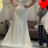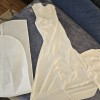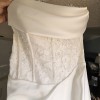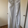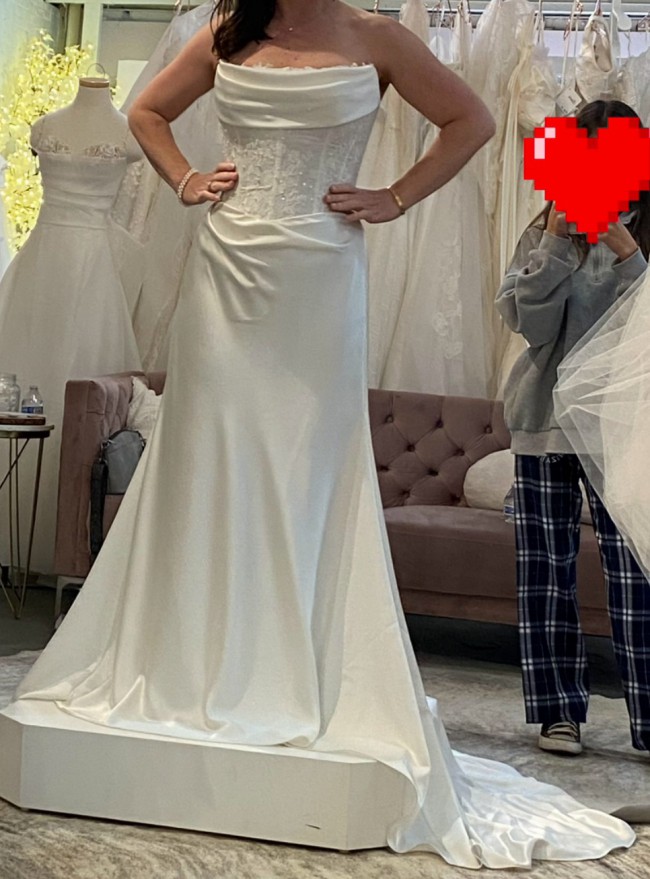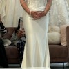 Purchased in bridal boutique after 3 weeks as a sample dress. Like new condition, no alterations. No damage or flaws. The satin feels so luxurious to the touch. There are 2 versions of this dress and this is the lined (corset) version. The neckline is flattering to the bust and the corset boning snatches you in at the waist.