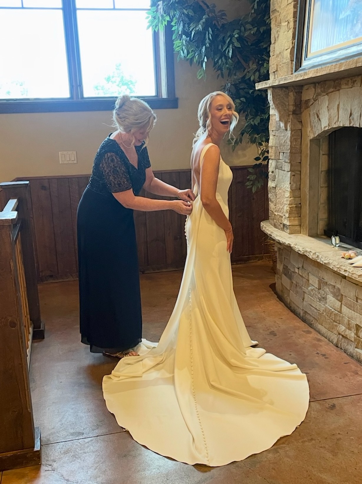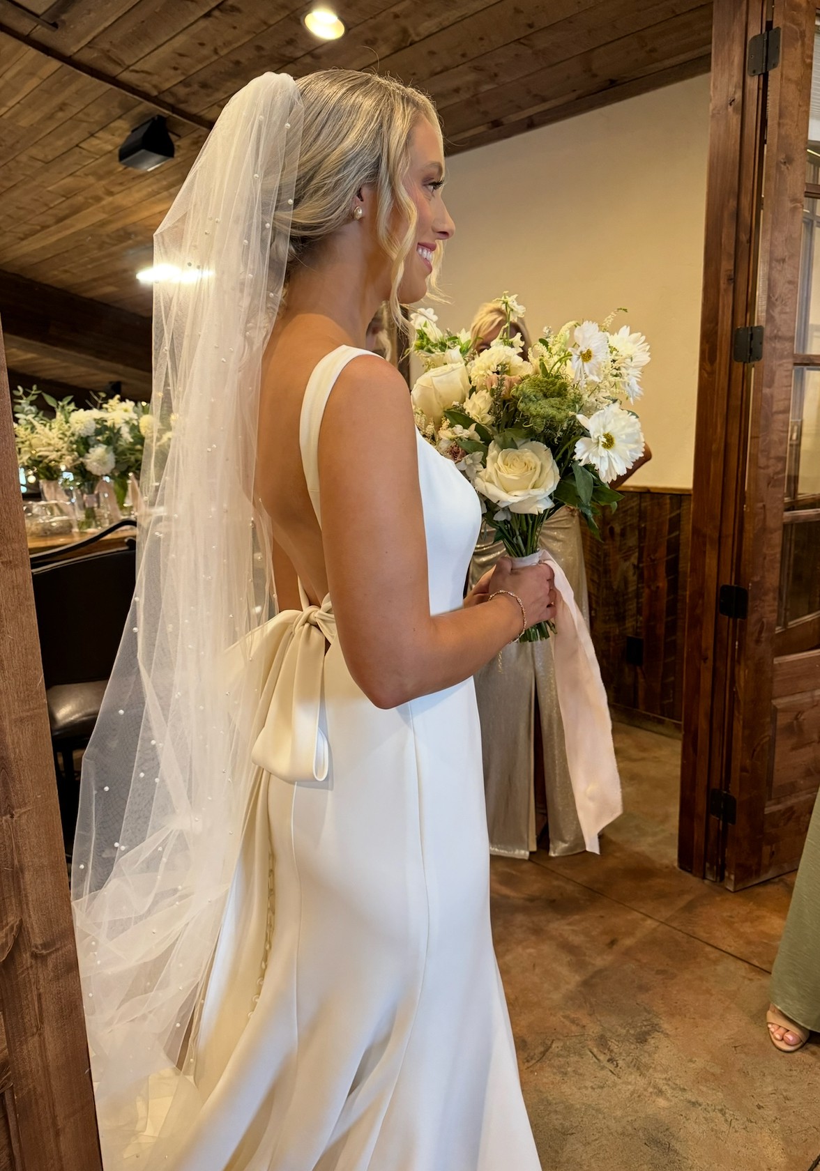 Excellent, like new condition. Dry cleaned AND preserved- will be send in preservation box. Buttons down the entire back of the dress. Bustle on back of dress.