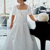 This one-of-a-kind dress was crafted using luxurious fabrics imported from Spain, including delicate Spanish lace, sumptuous silk, and rich taffeta. The structured bodice and graceful off-the-shoulder sleeves offer a regal silhouette, while the removable 25-foot taffeta train and matching chiffon veil add drama and romance in every step. St. Patrick has an incredibly long aisle, and the long train completed the feeling of royal elegance.