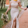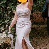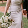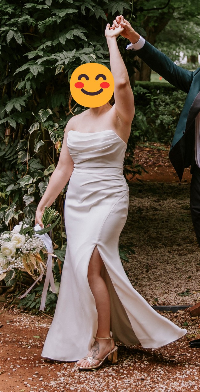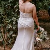 Wrapped in luxe liquid crepe, this chic ivory column gown exudes clean simplicity and contemporary sophistication. The strapless neckline naturally unfolds into a pleated and draped bodice that accentuates the natural silhouette. In the back, fabric-covered buttons form a timeless row from the top of the bodice to the edge of its sweeping train. A minimalist sheath skirt glides across the form like liquid to part at the front in a sexy side slit. Style D3634 is everything a modern bride could dream of. This wedding gown is also available in plus sizes.