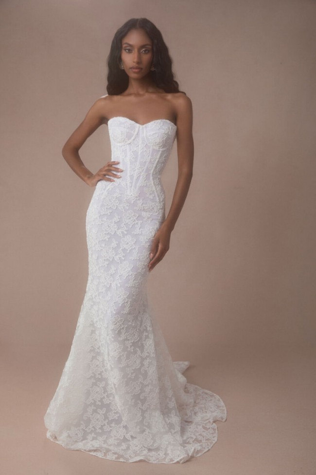 Josie liquid by Sara Seven. A strapless floral lace fitted gown with inner corset.