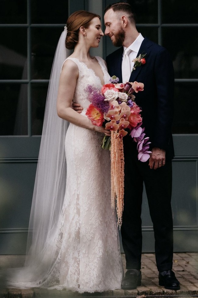 Gorgeous Demi wedding dress from Paddington Weddings. Soft pink underlay with ivory French Chantilly lace over the top with lace train. Tasteful plunge scalloped neckline with gorgeous deep v at the back. Comparable to the Lucia dress currently retailing for $4250. Absolutely adored this dress and I hope someone else will too. Subtle imperfections in the lace and veil as pictured.