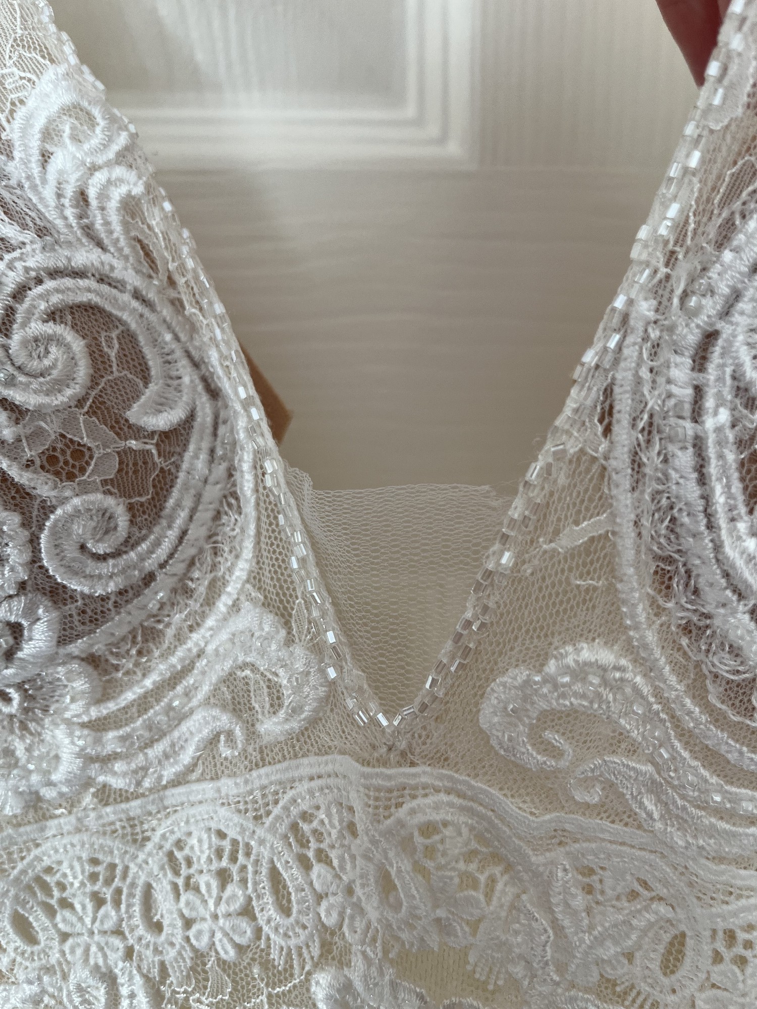 It has a very small pull line at the bottom of the dress which I’ve included in the photos. The cover up in the bust which I had added to the dress has a small tear in the side (photo included) so this would need a repair or the addition just cut away from the dress.