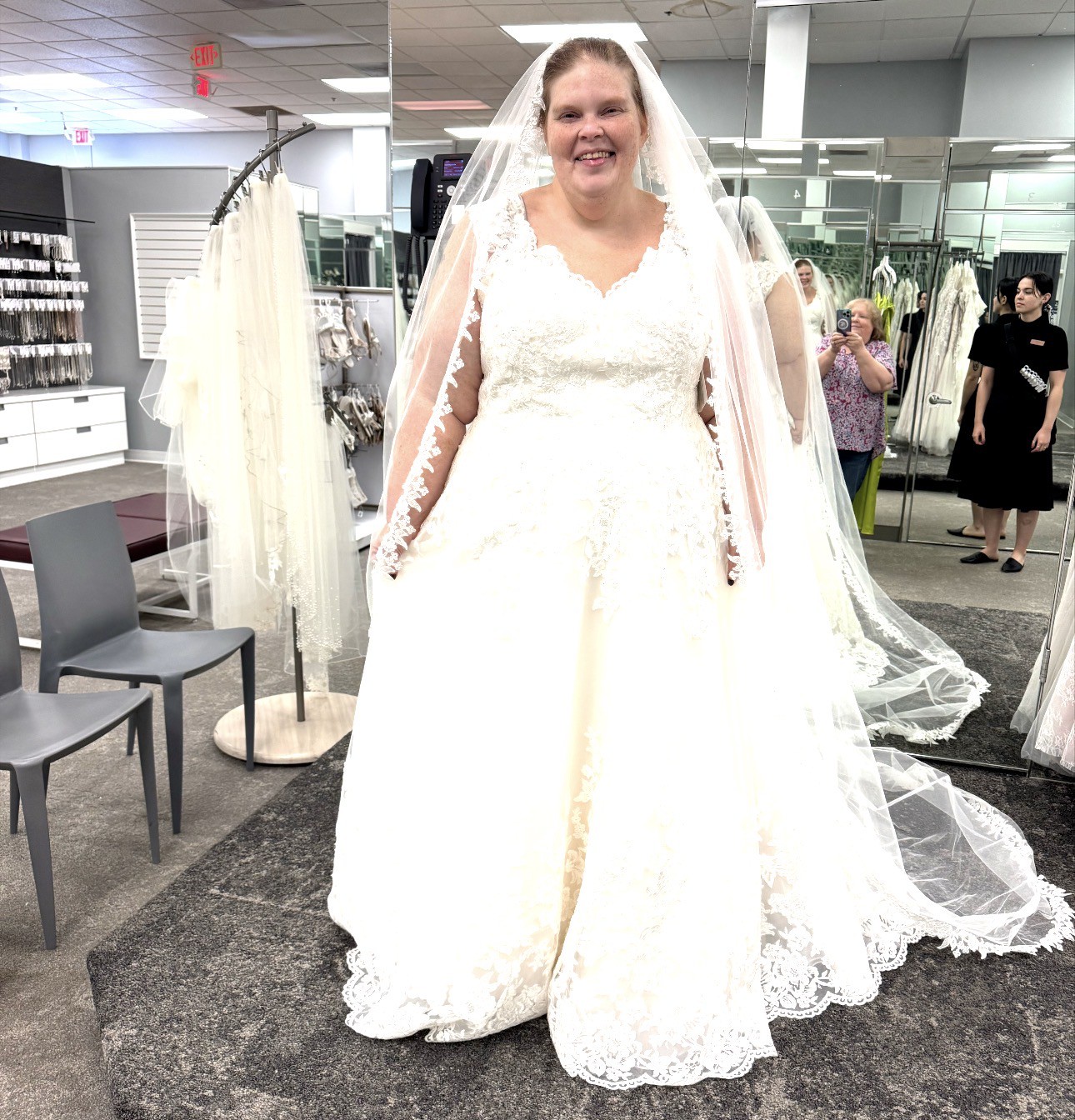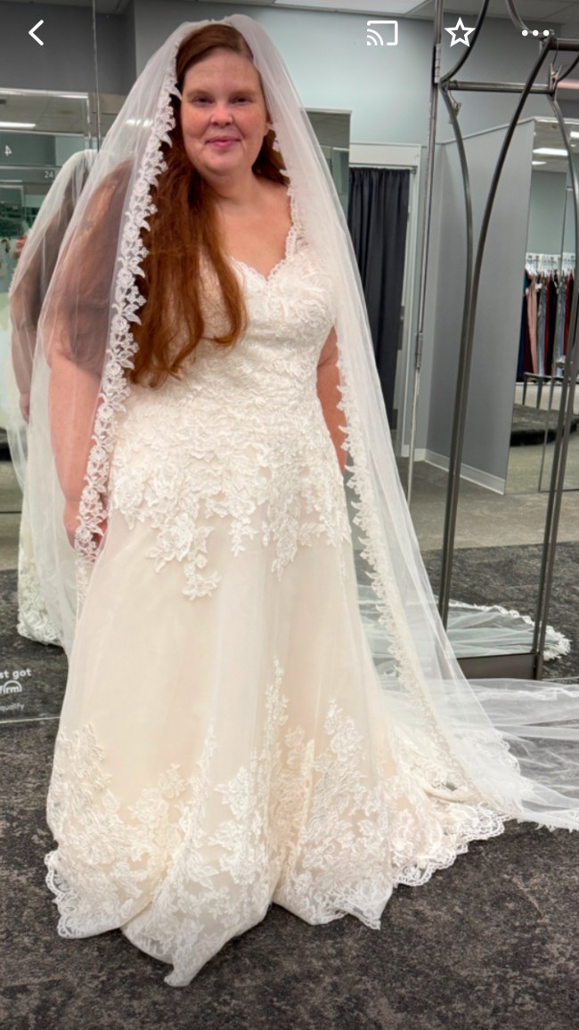 I love this gorgeous dress! In lists of photos I picked this one, over and over again. I must have looked at literally THOUSANDS of dresses before I decided on this one. I am VERY DIFFICULT to fit and shop for because of a health problem with swelling I have. I change sizes in my body frequently due to this health condition. So when I took a trip to David’s Bridal in Kennesaw, GA and only tried it on the one time for the photo…I immediately bought it!
