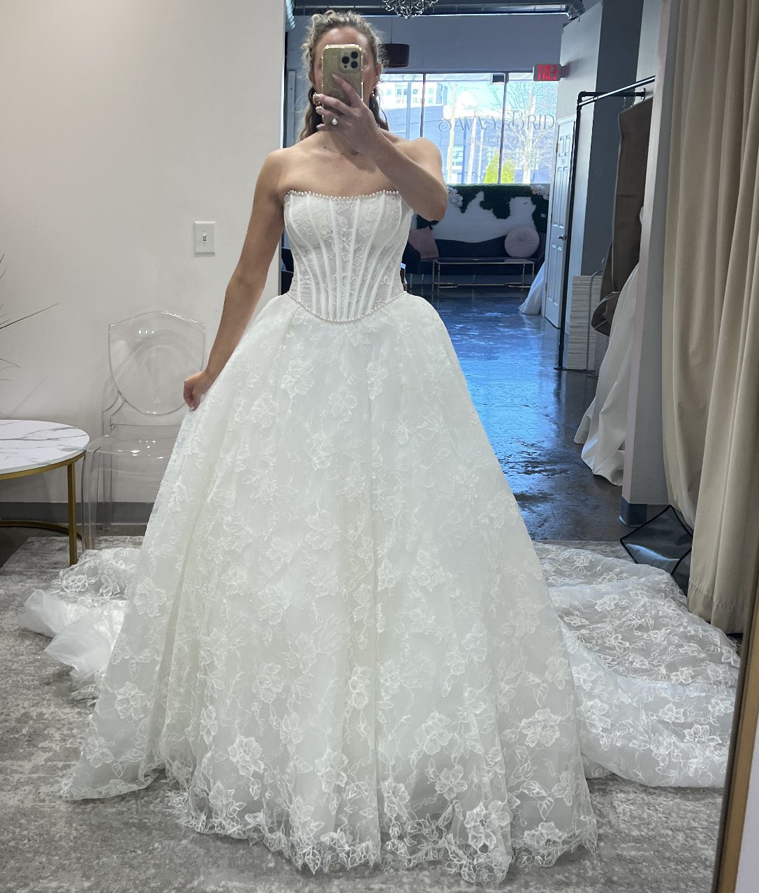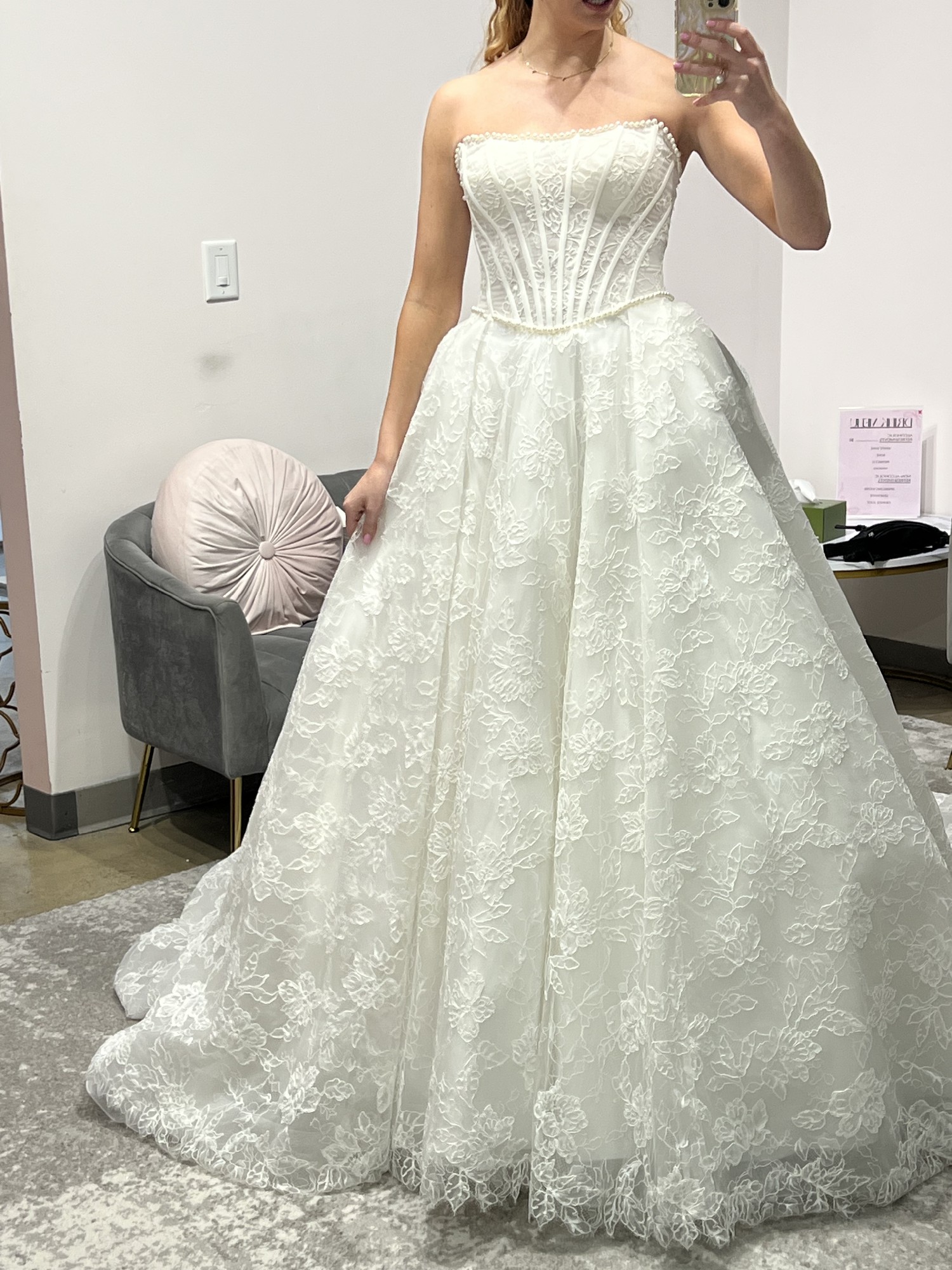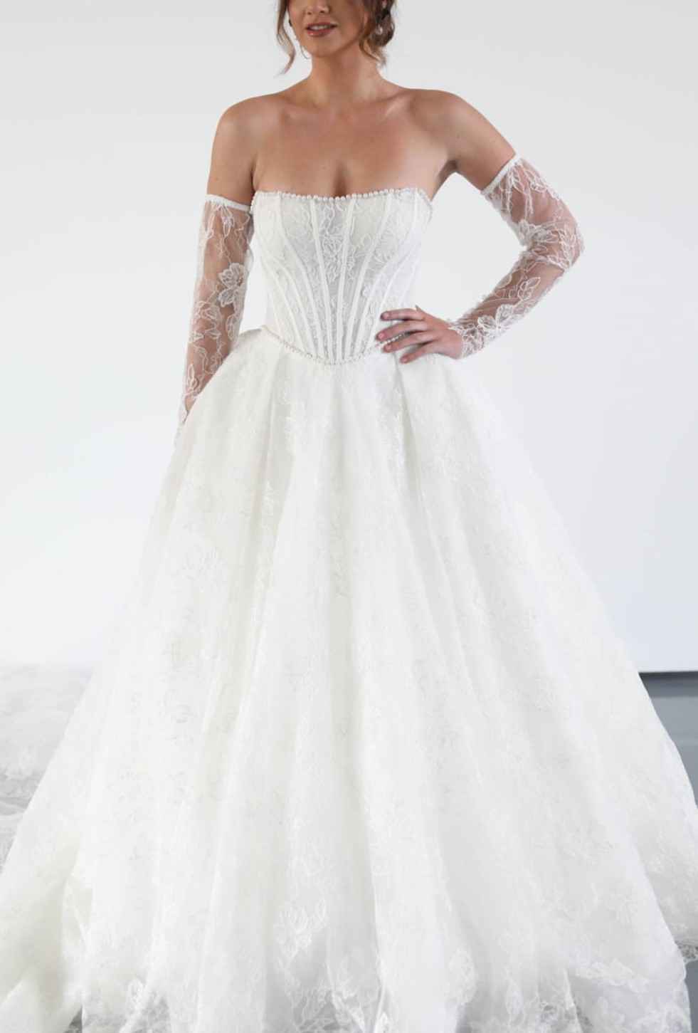 Brand new! Never worn! Not Altered! Pearl lined lace ball gown with Sleeves included! A true stunner!