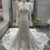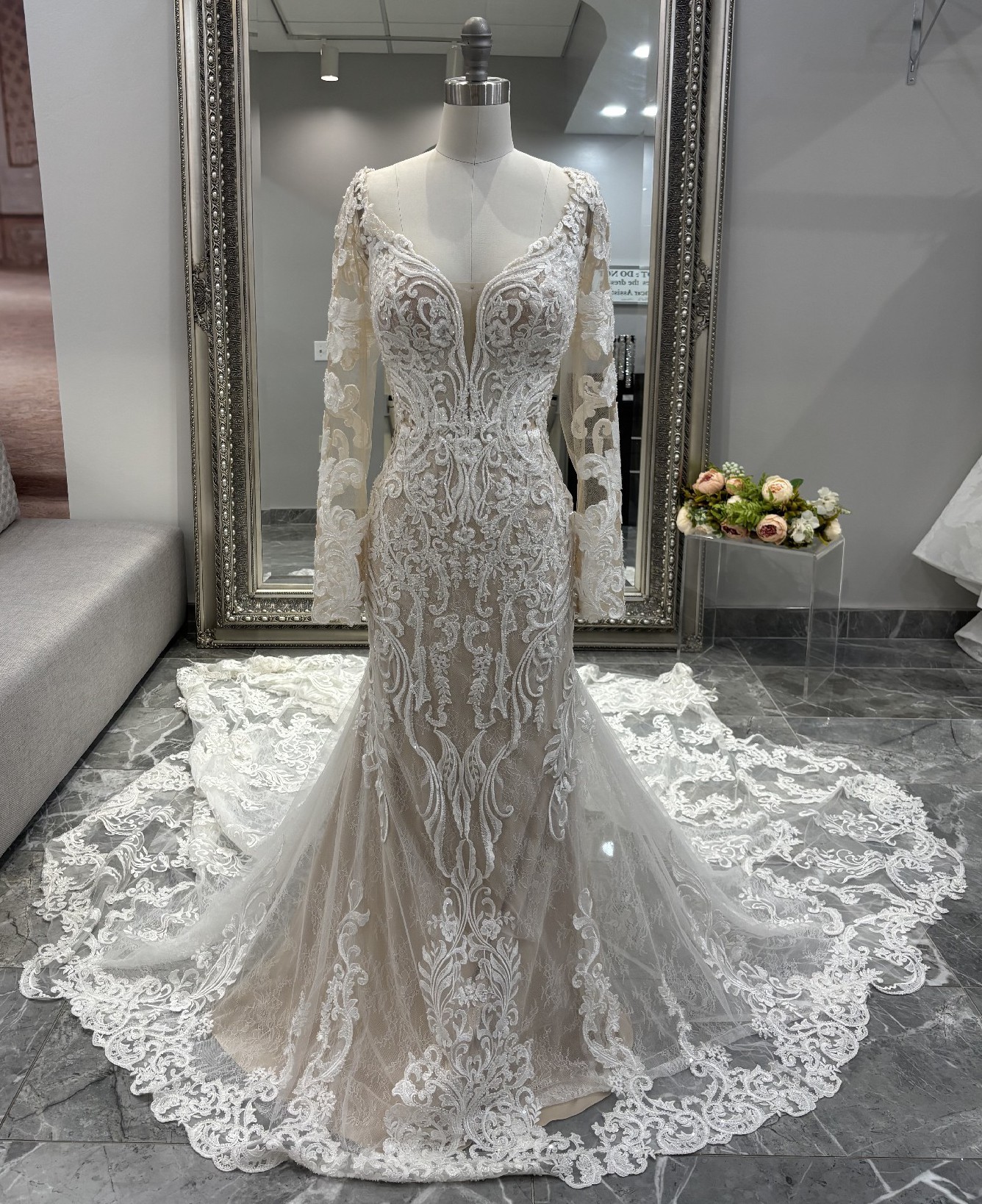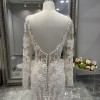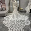 Of course lace can be sexy! With all-classic inspiration, this fashion-forward bridal gown from Martina Liana will turn heads at your modern wedding. Diamond-shaped cutouts and French laces create multiple levels of negative space detailing, creating a strong focal point for this unique style. Additional layers of French tulle and laces are added in the bust for extra coverage within the sheer bodice, so you can go bold without going overboard. Large scallops create the breathtaking train—flowing from underneath the fitted bodice for a soft, ethereal feel to this searing silhouette. A bold open back is highlighted with floating laces on long sleeves—also featured along the deep V-neckline—adding a gentle simplicity that highlights your neck and shoulders perfectly. The back of this wedding dress zips beneath fabric-covered buttons, a traditional touch which flows throughout the exquisite, modern train.