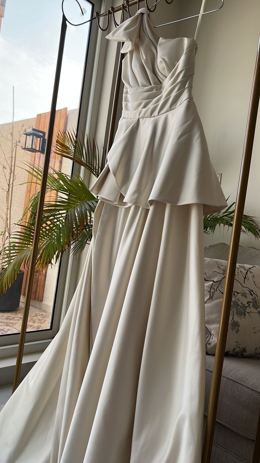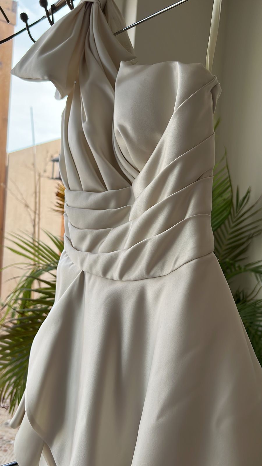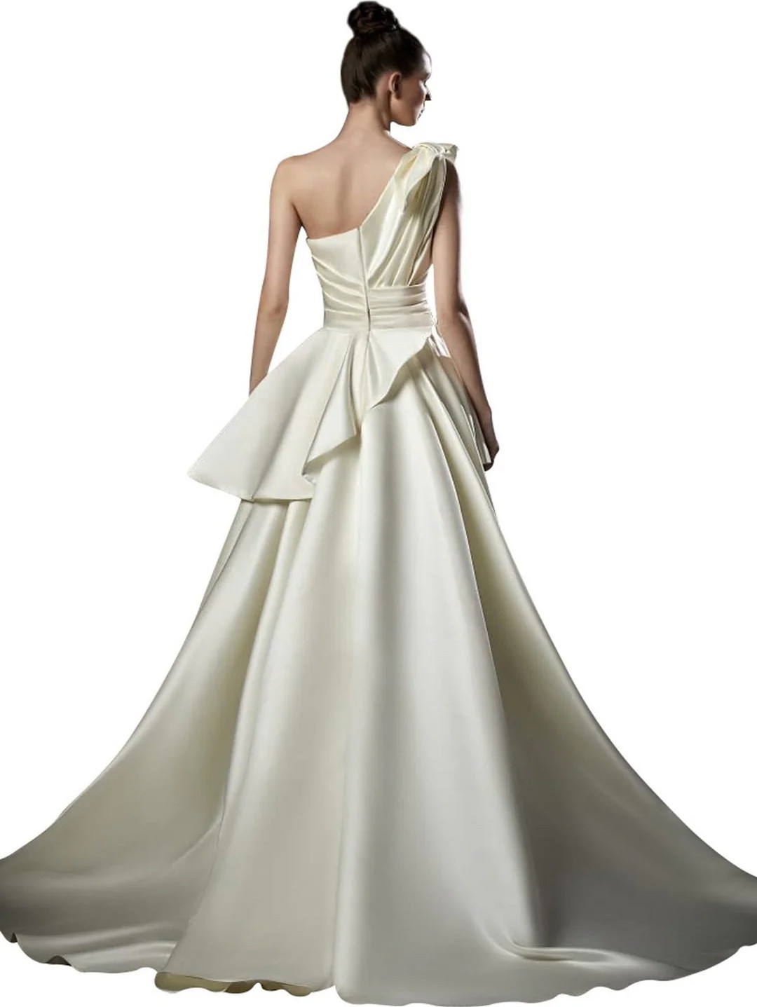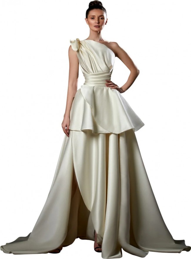 Step into refined elegance with the Ziad Germanos ZG90, a masterpiece designed to captivate at any distinguished event. Crafted from rich Mikado fabric, this long A-line gown combines structure and fluidity, draping effortlessly while maintaining a commanding silhouette. The one-shoulder neckline and sleeveless design highlight your grace, while the pleated bodice and peplum detail flatter your figure with artistic precision. A tasteful slit adds movement and allure, complemented by a discreet zipper back for a seamless fit. Whether gracing a gala or wedding, this couture creation elevates your presence, ensuring you embody sophistication and timeless glamour.
