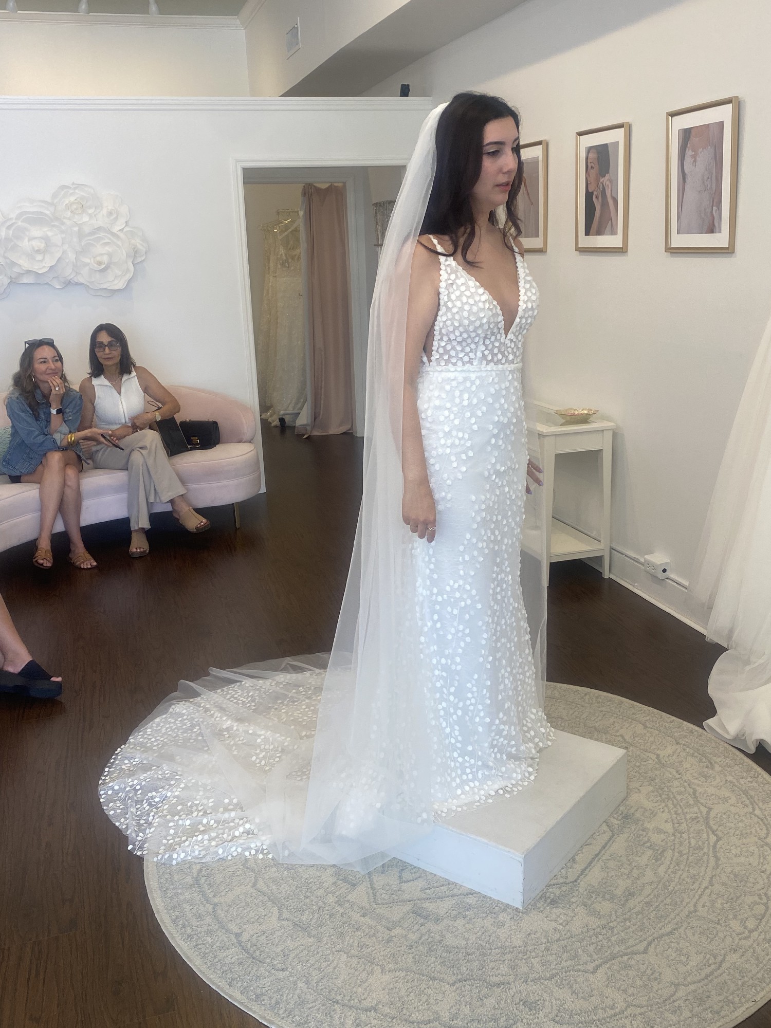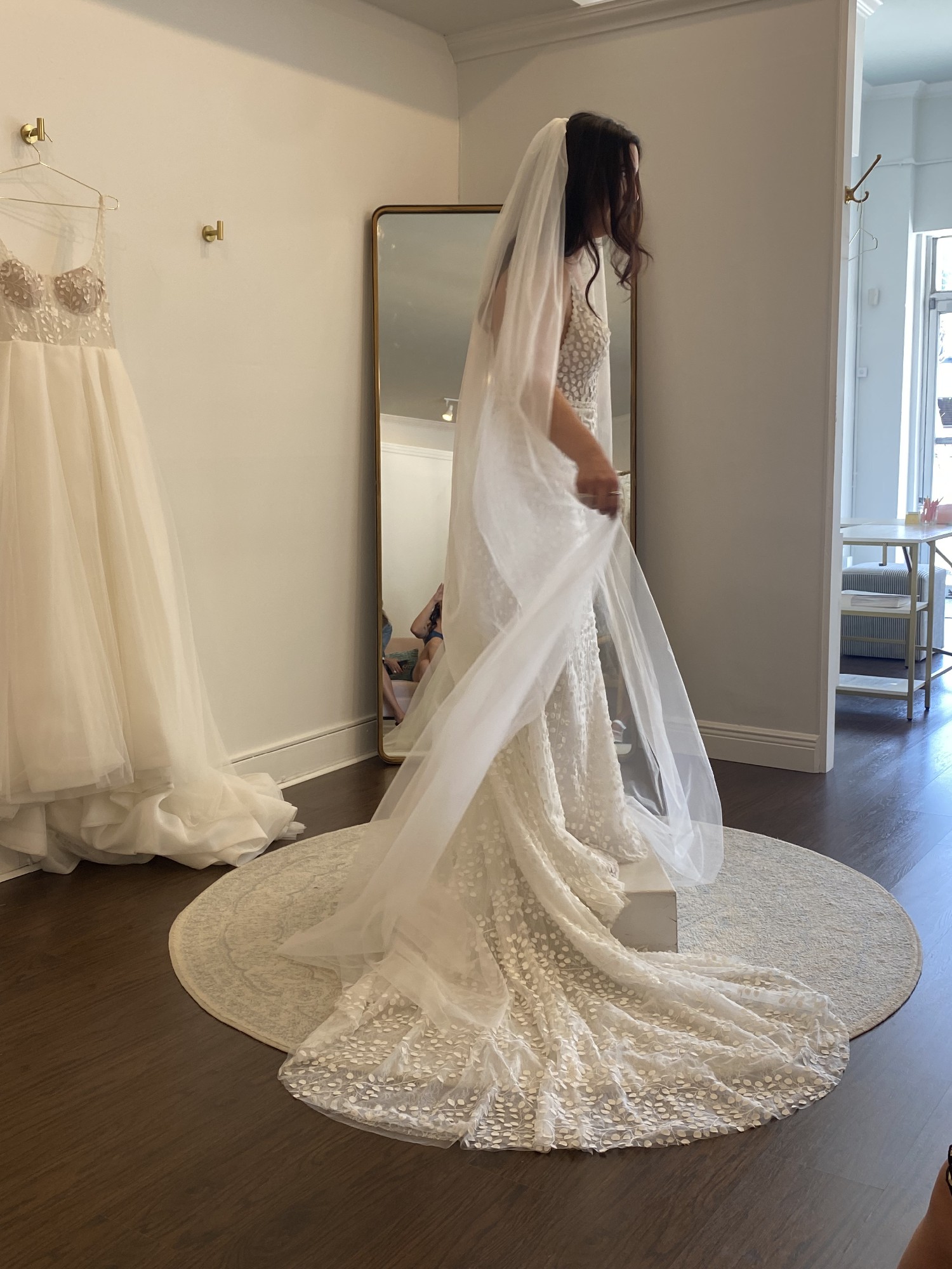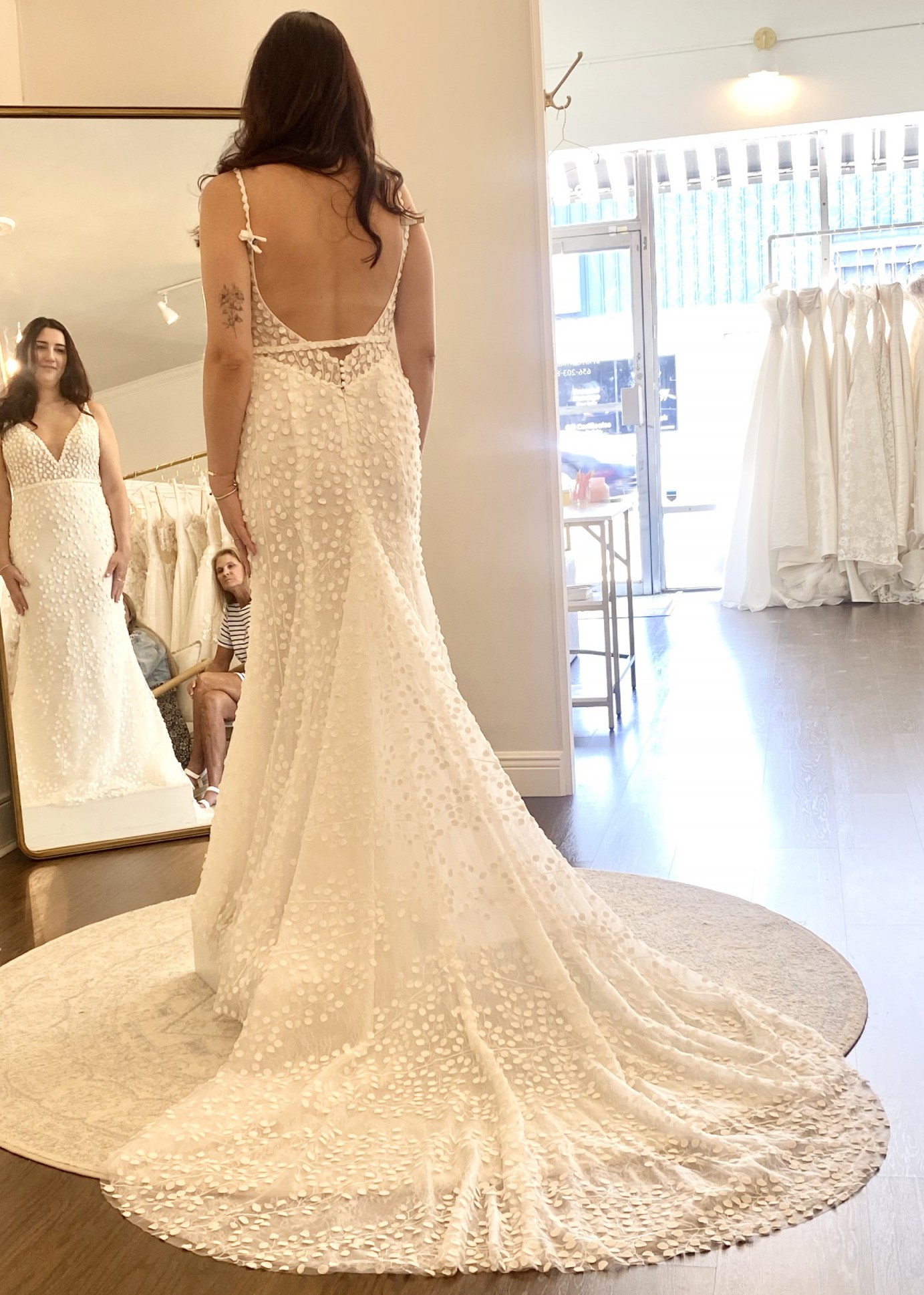 Brand new, bag never opened, dress never altered. Purchased extra shimmer material for alterations which came separate.
