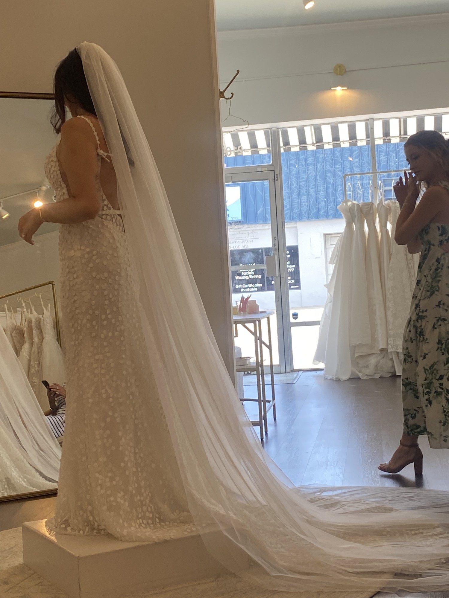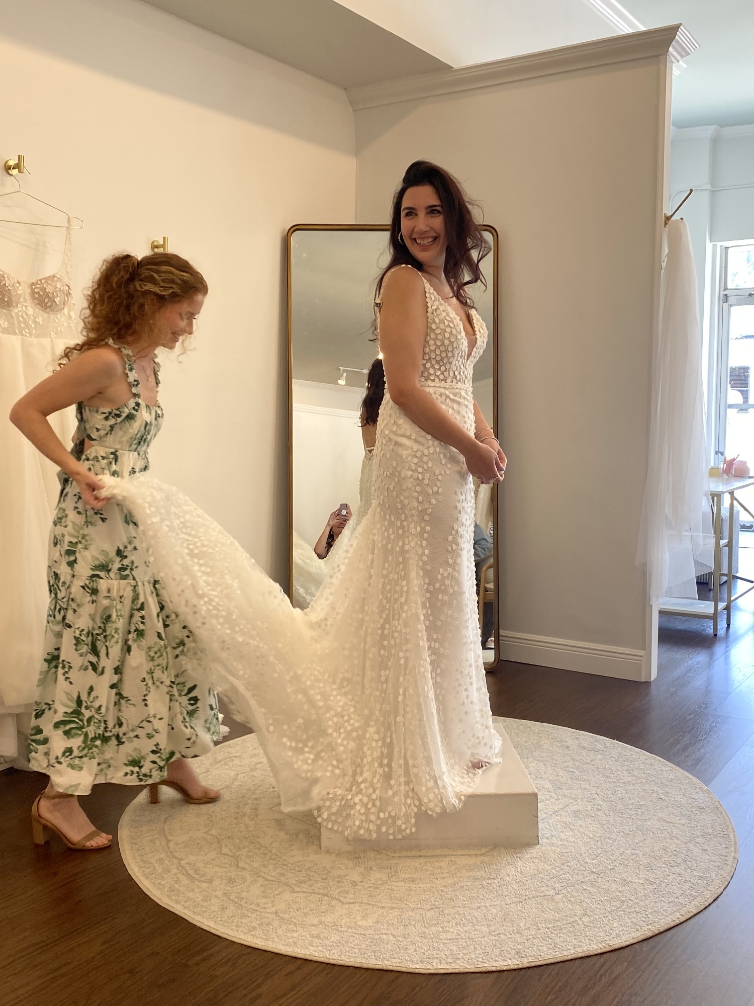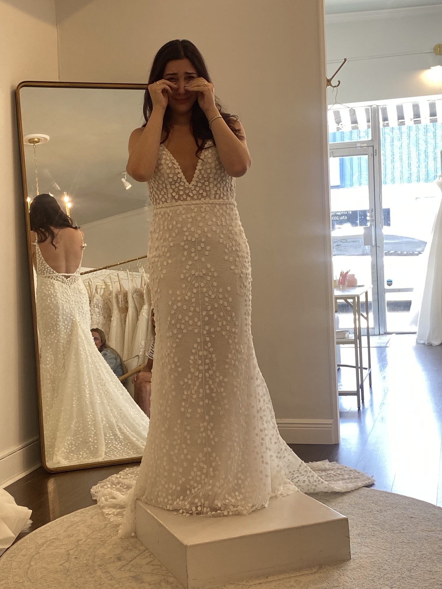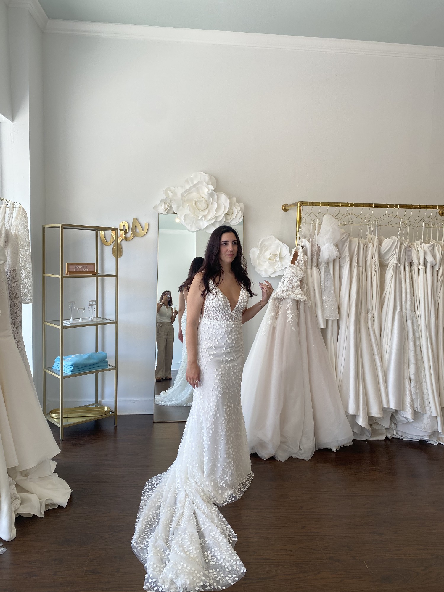 Brand new, bag never opened, dress never altered. Purchased extra shimmer material for alterations which came separate.