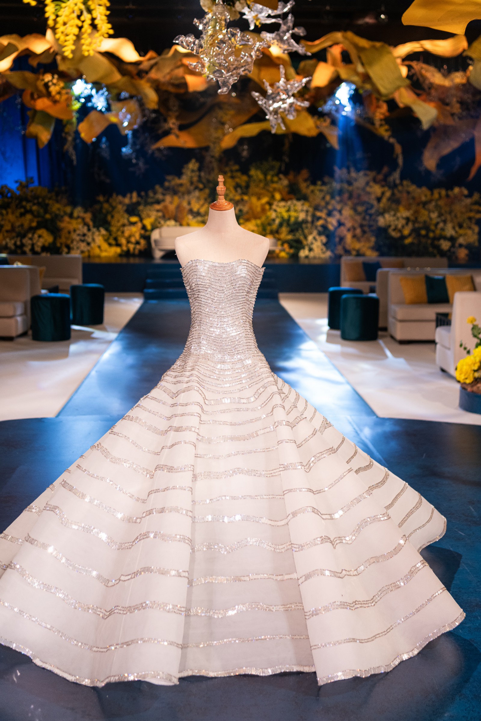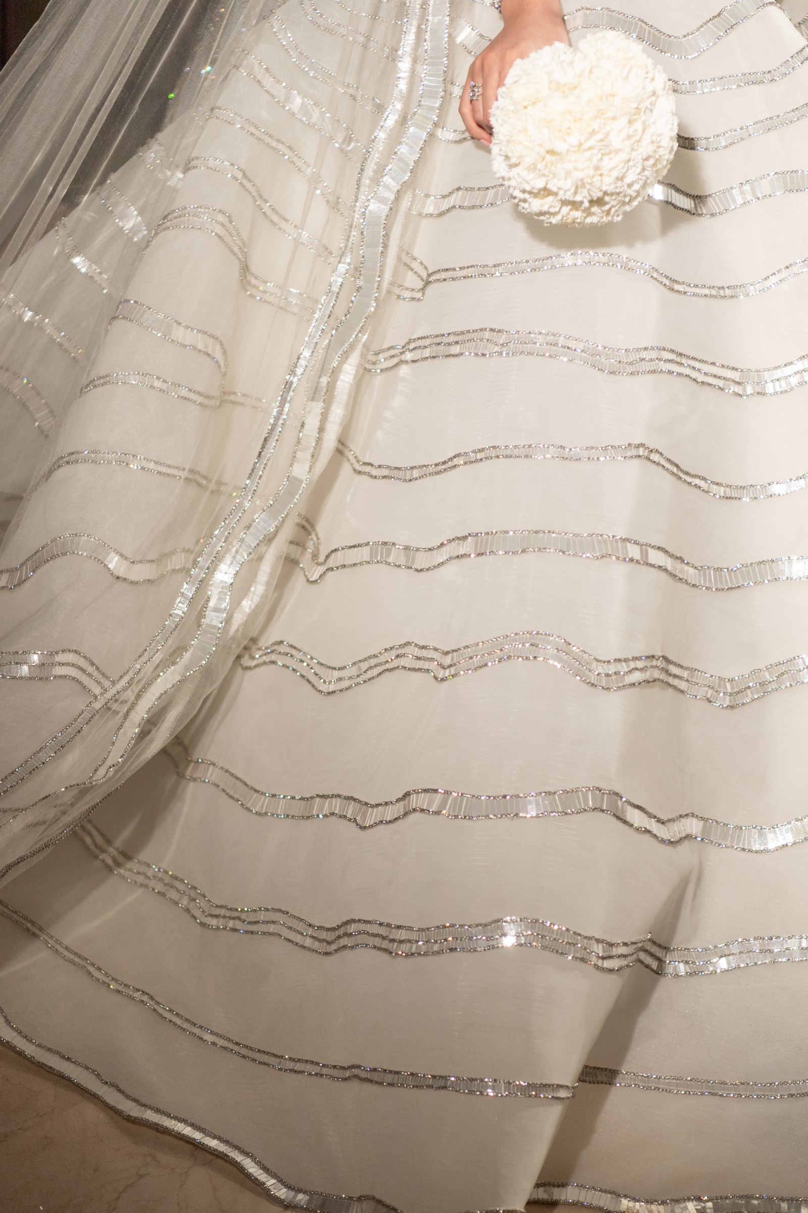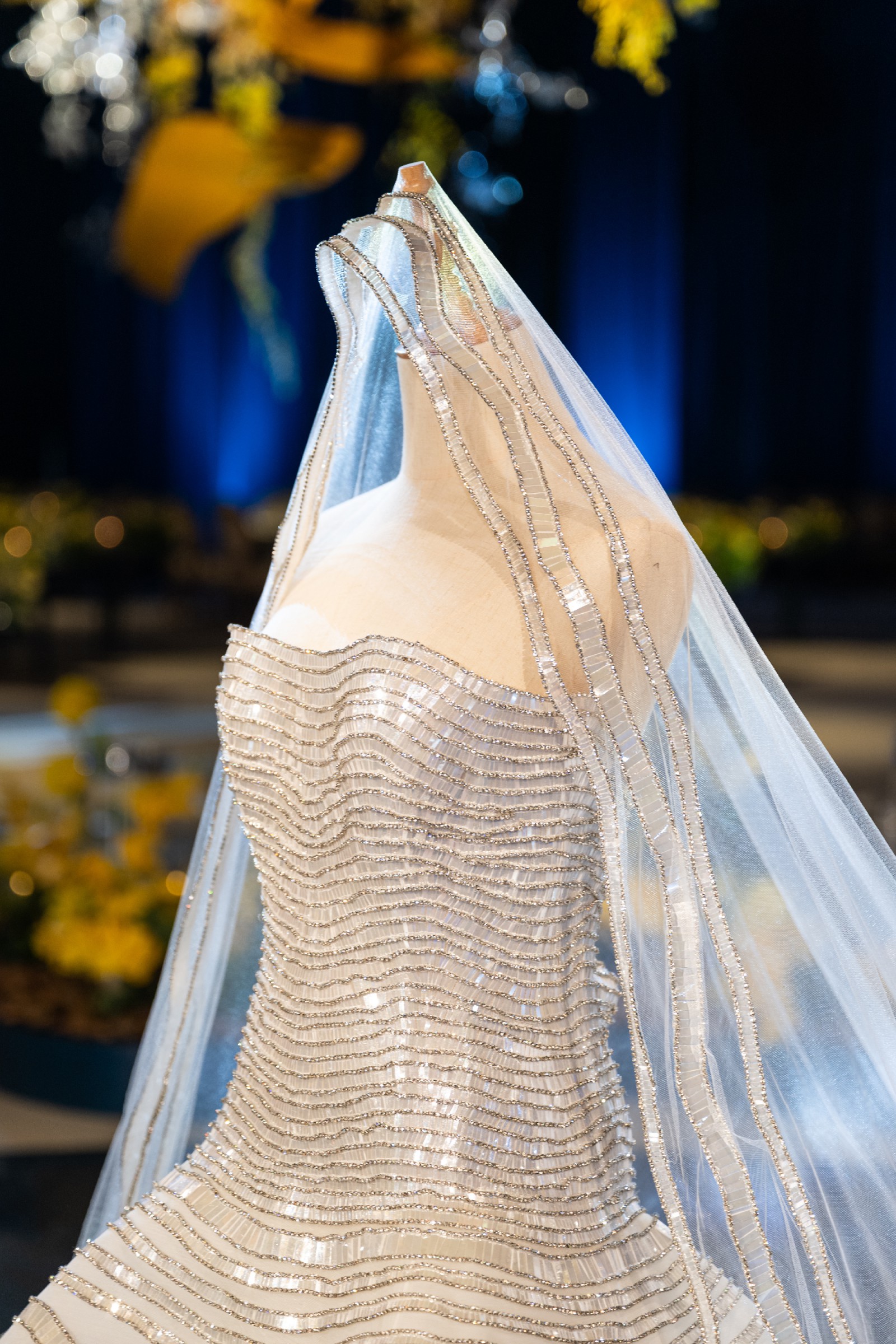 A stunning custom couture "Maison Yeya" gown, which is a Dubai-based fashion house,The dress is designed with symmetric waves of sparkle and a graceful drop waist that flatters the figure, with a boned corset. The Voluminous ballgown skirt creates a true princess moment, making you feel like a diamond walking down the aisle.Perfect for the seeking elegance, glamour, and timeless beauty.