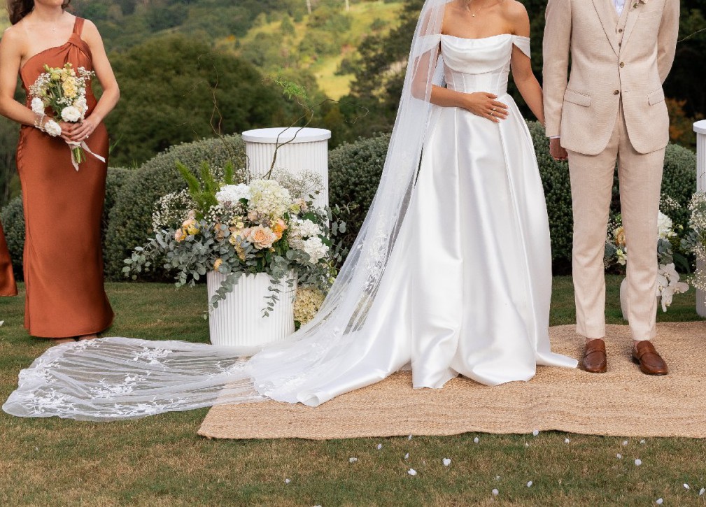 This Celine wedding dress from Made With Love is the epitome of elegance and romance. From the moment I slipped it on, I knew it was the one. The beautiful ivory satin glides effortlessly over curves, while the ballgown silhouette brings an enchanting fairy-tale vibe to any wedding day. The strapless design is perfect for showcasing your shoulders and collarbone, and the alluring low back adds just the right amount of drama for an unforgettable look.