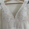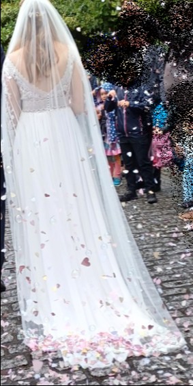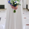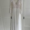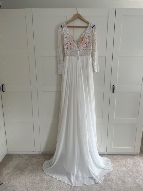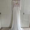 The back extends into a soft train, offering just the right amount of drama without being heavy. Lightweight and easy to wear, this dress combines classic bridal style with modern elegance—perfect for a bride who wants to feel graceful and comfortable from ceremony to reception.
