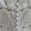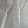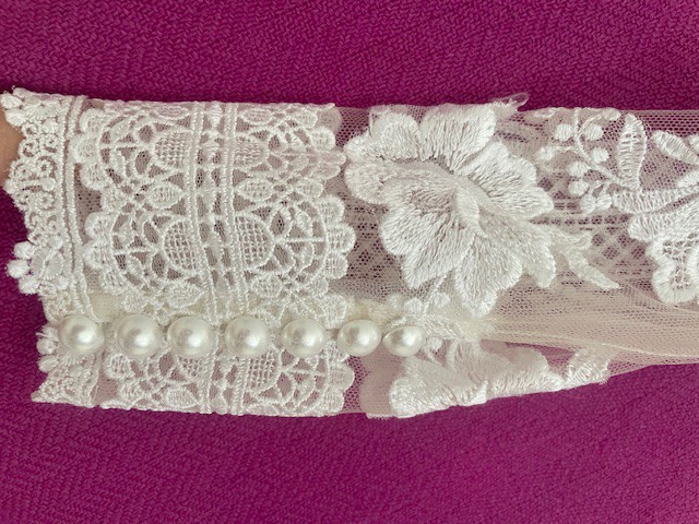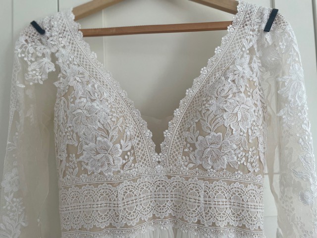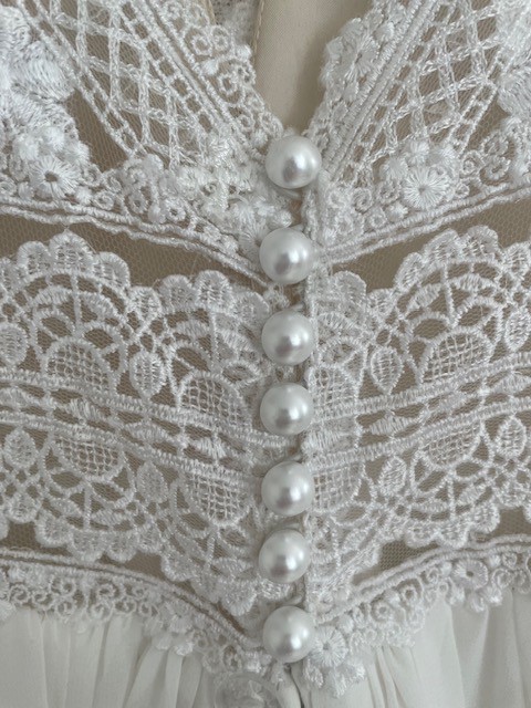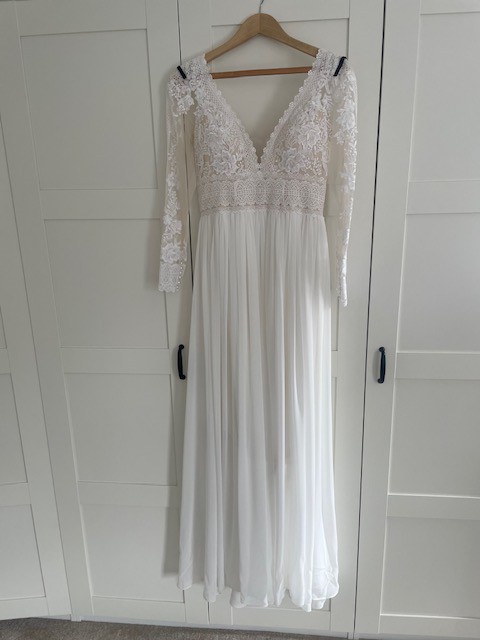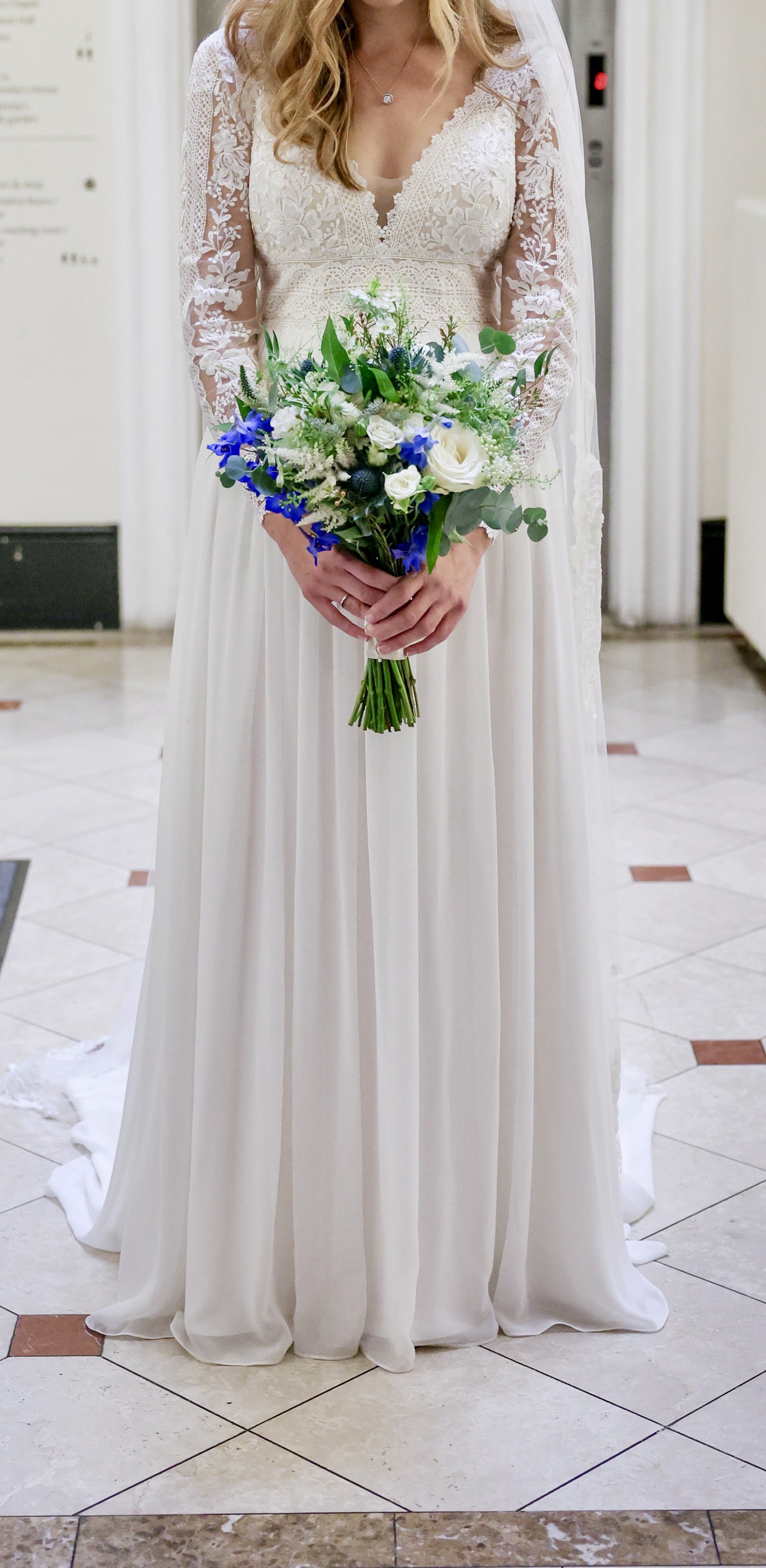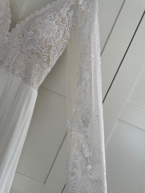 This elegant wedding gown features a timeless A-line silhouette that flatters all body types. The bodice is adorned with delicate lace detailing and a scalloped V-neckline, creating a romantic and feminine look. Sheer lace sleeves with intricate floral patterns add a touch of sophistication, while the flowing chiffon skirt drapes beautifully for effortless movement and comfort throughout the day.