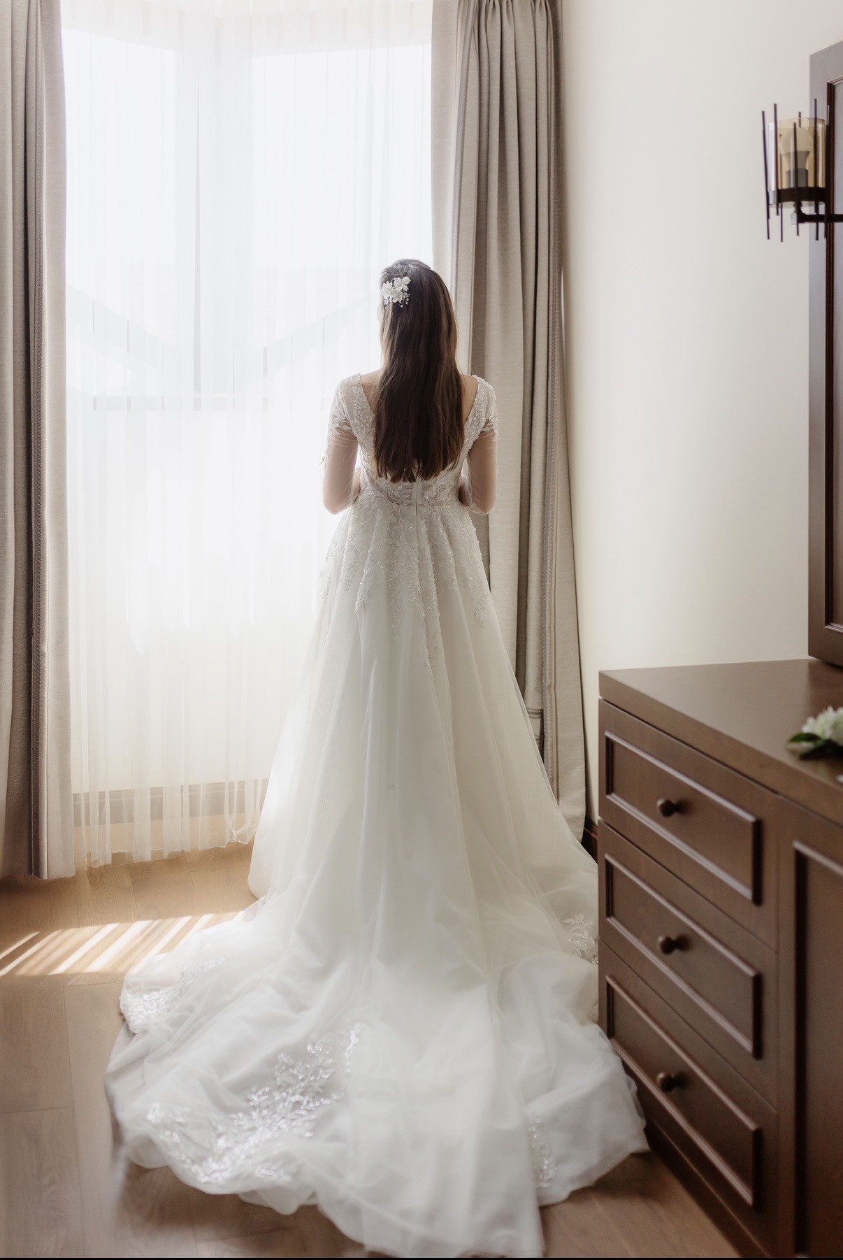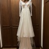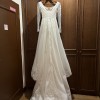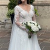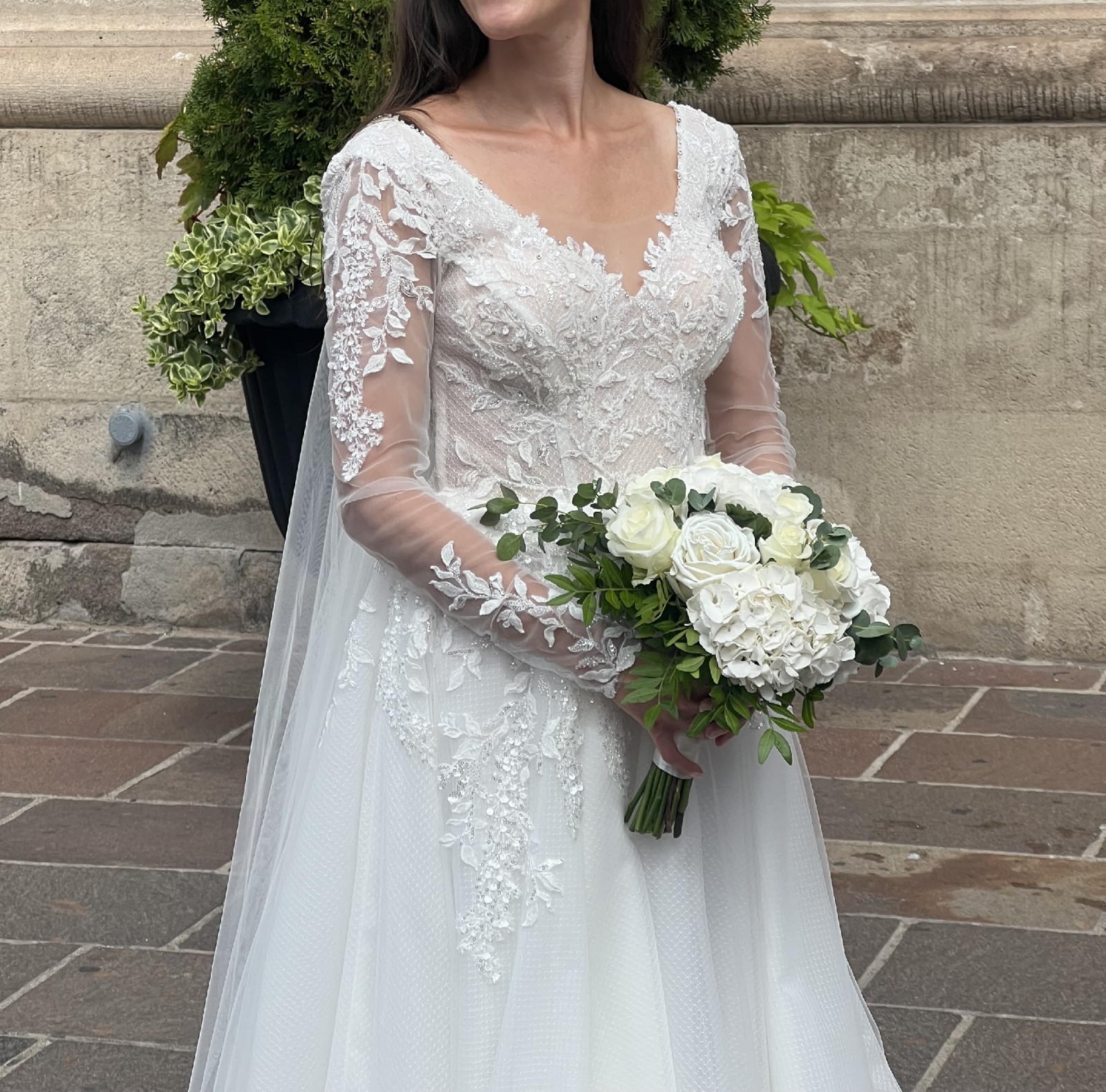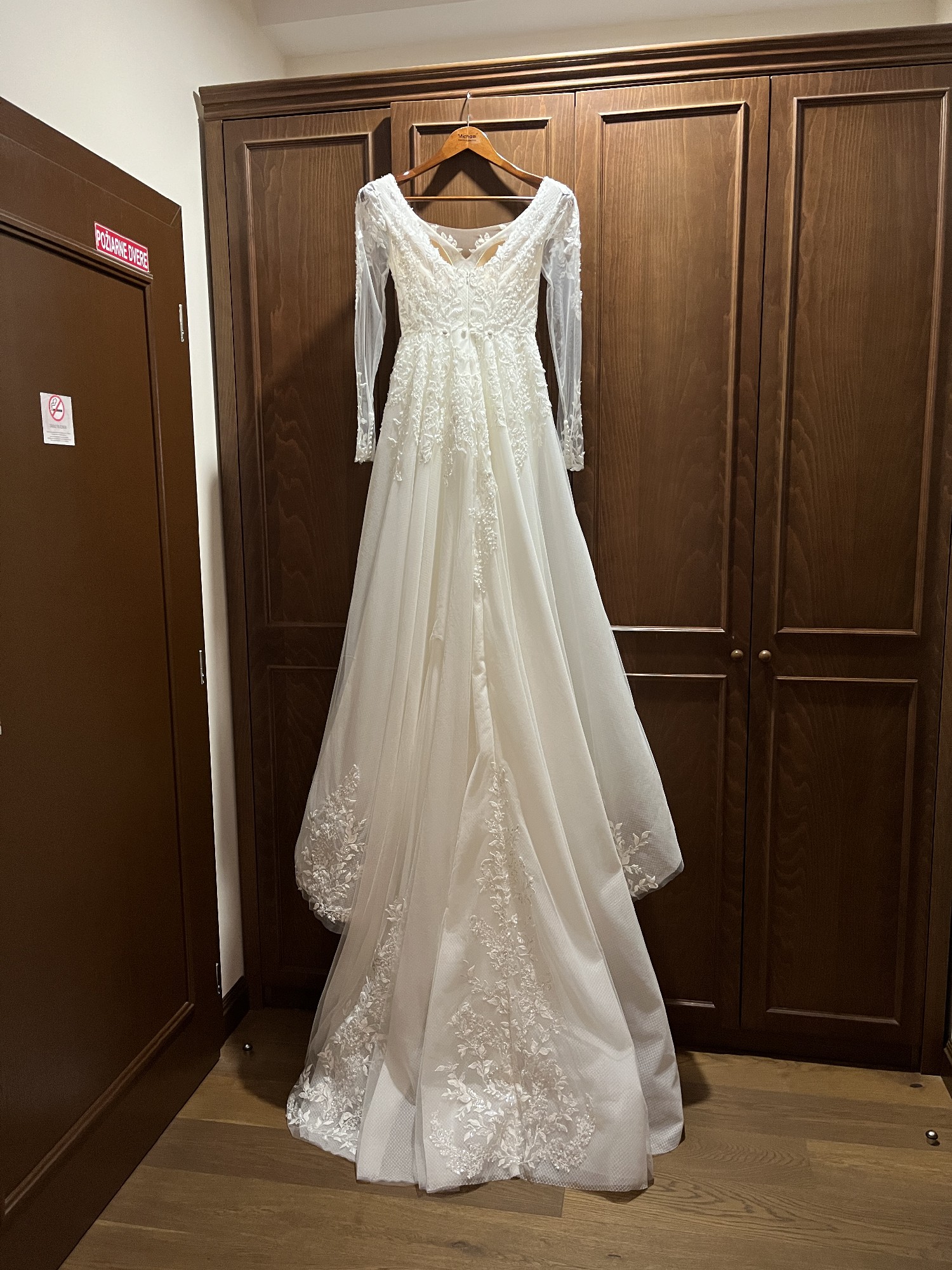 The dress has a modest V-neck, beautiful lace and beaded flower detailing all over the bodice as well as the bottom and the top of the skirt. A loop and a bustle were both added to enable the ease of movement and dancing as the dress has a gorgeous long train. It has been professionally cleaned and comes with a travel bag and a veil.