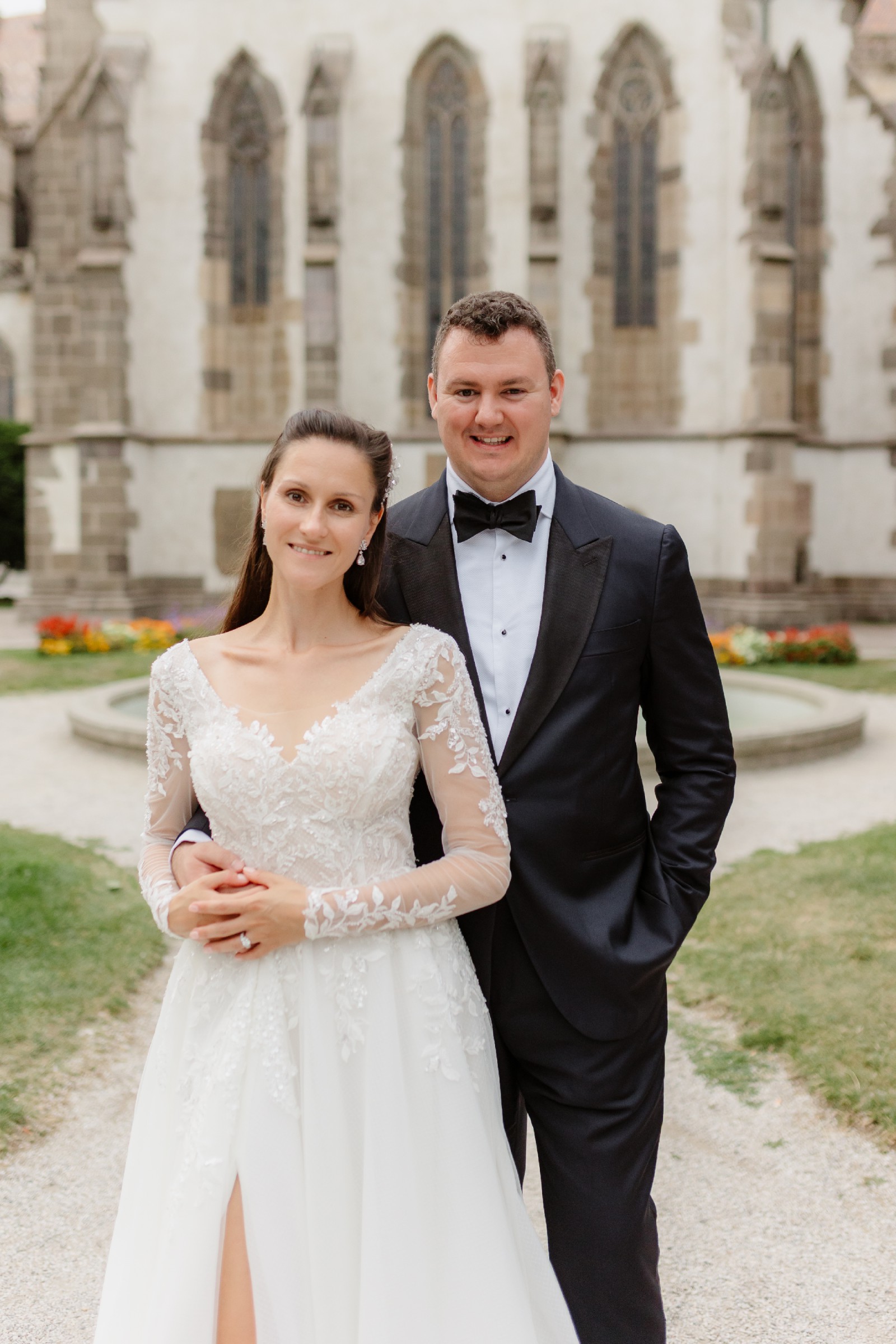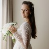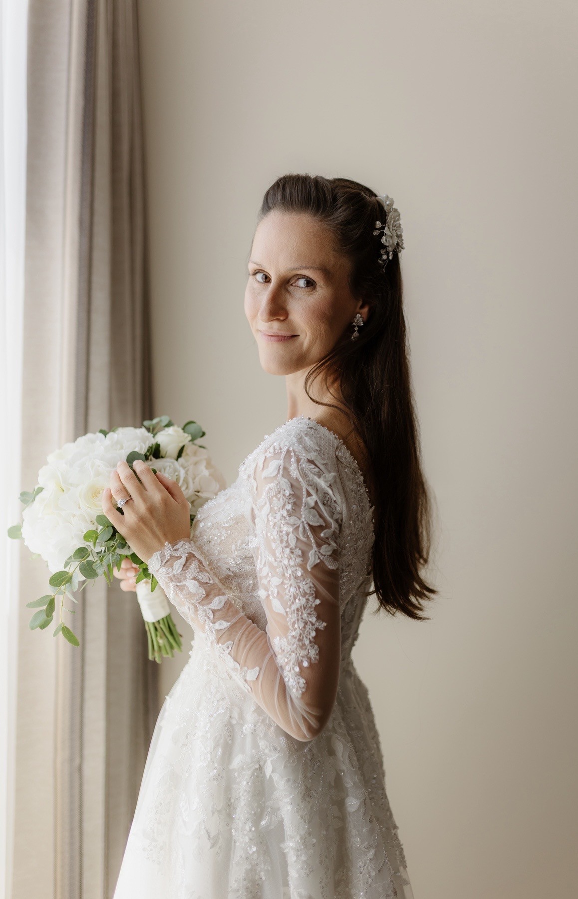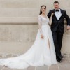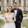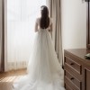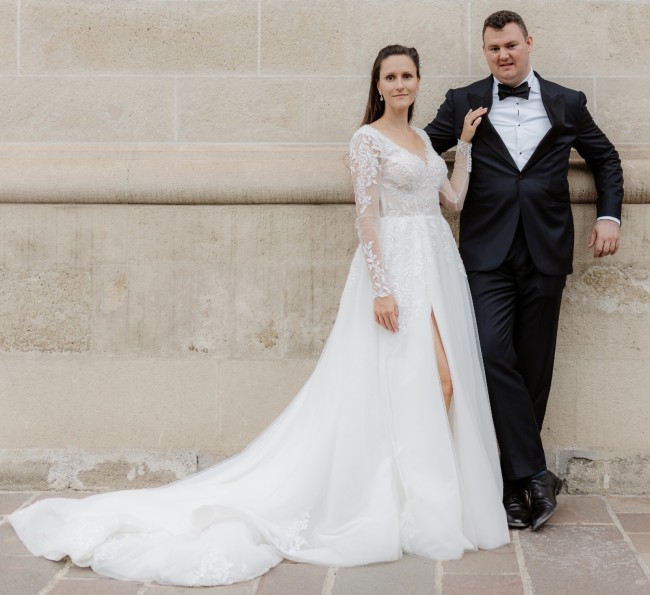 The dress has a modest V-neck, beautiful lace and beaded flower detailing all over the bodice as well as the bottom and the top of the skirt. A loop and a bustle were both added to enable the ease of movement and dancing as the dress has a gorgeous long train. It has been professionally cleaned and comes with a travel bag and a veil.