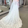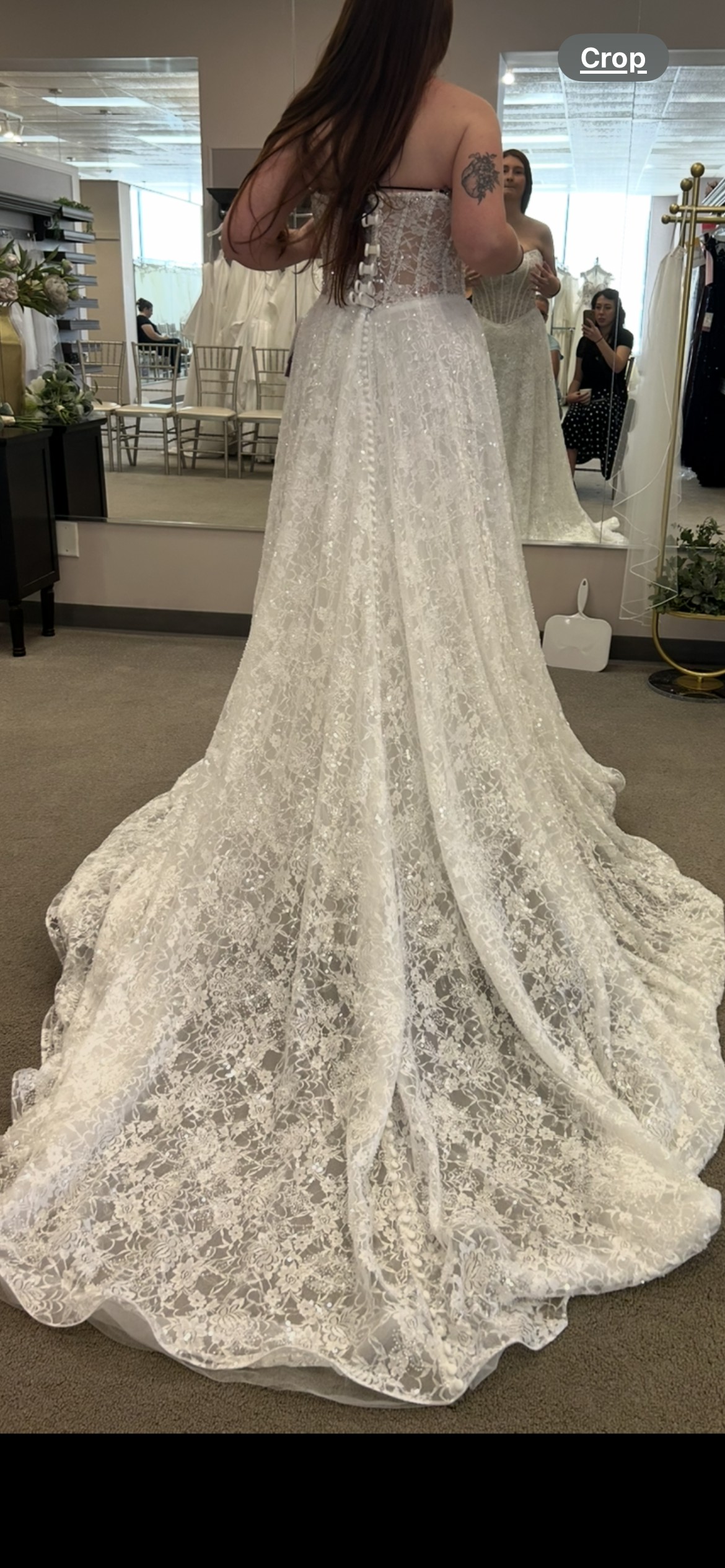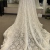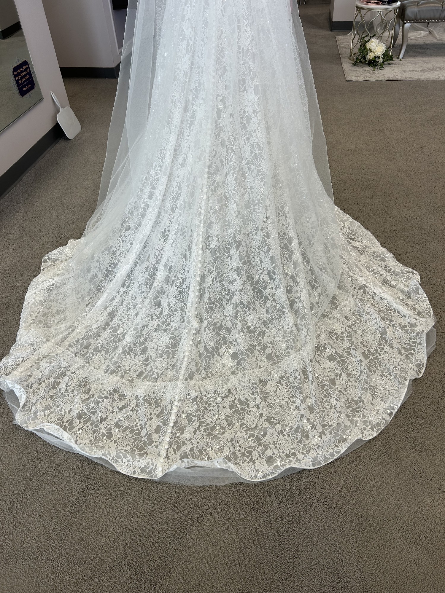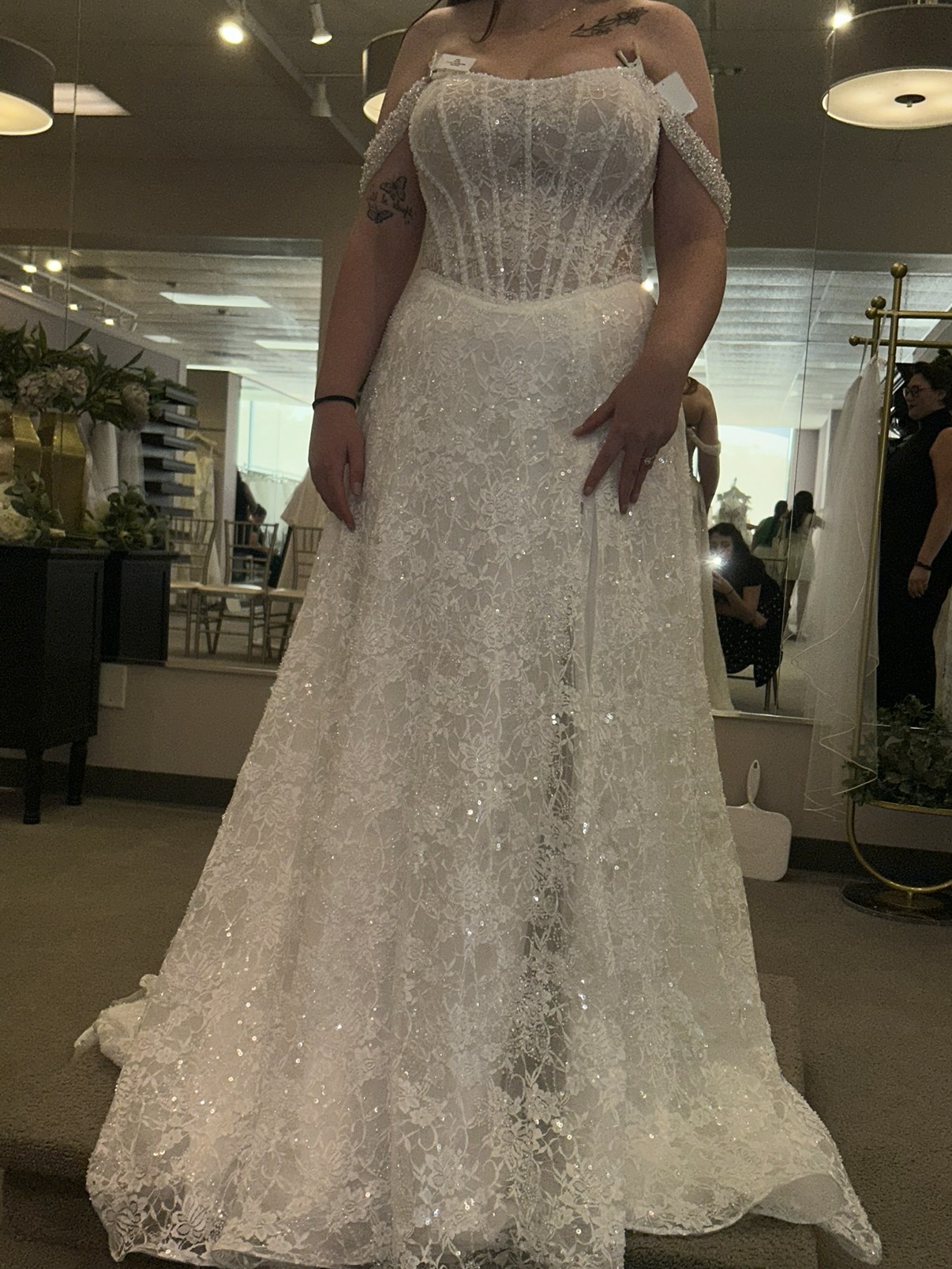 Chantilly lace, Aline, sequin/beading, basque waist. Zipper and buttons in back. Corset boning. Ivory colored. High slit