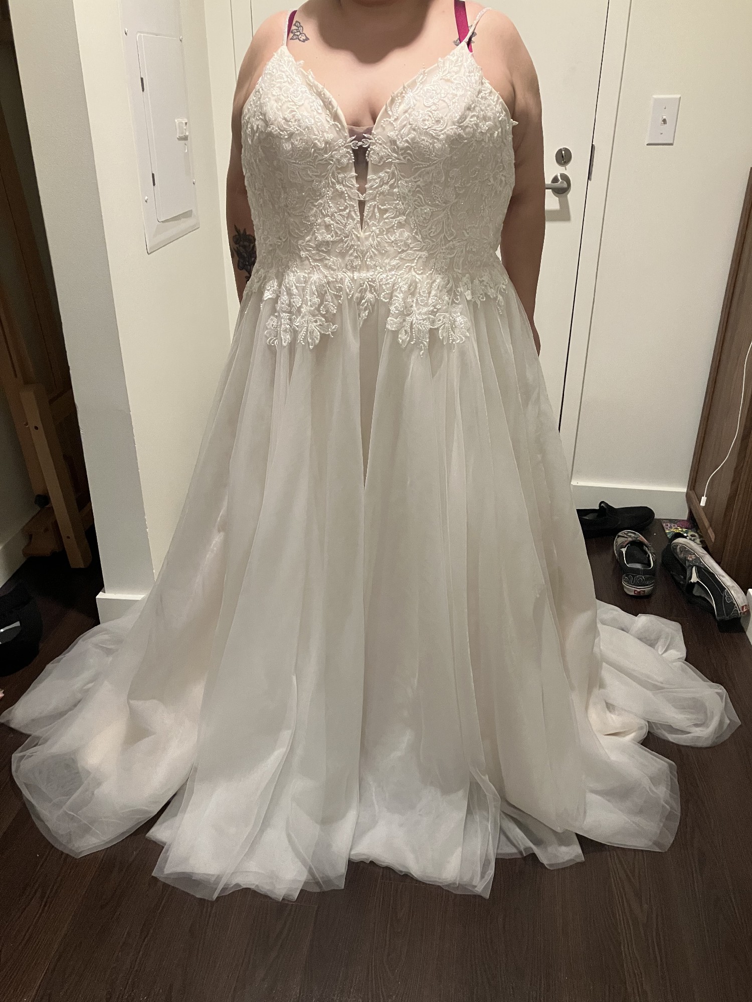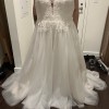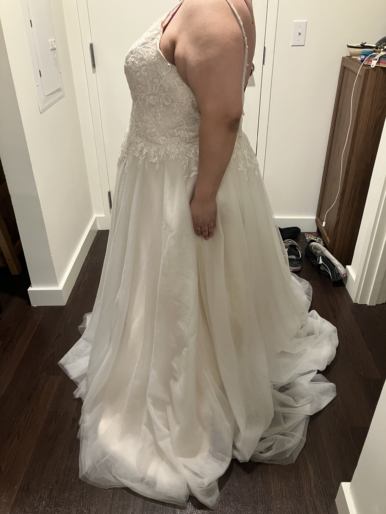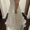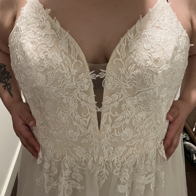 Beaded Spaghetti Strap plunging v-neck, sequin lace top, with full tulle a-line skirt. Main color is ivory with oyster as an accent color. Never been used, so it’s is unaltered. I’m a 38D for reference, 5 foot 5, typically a size 18 and this dress is an 18 and fits comfortably around the chest and torso, just straps and length really needed to be altered. Also: comes with pink garment bag