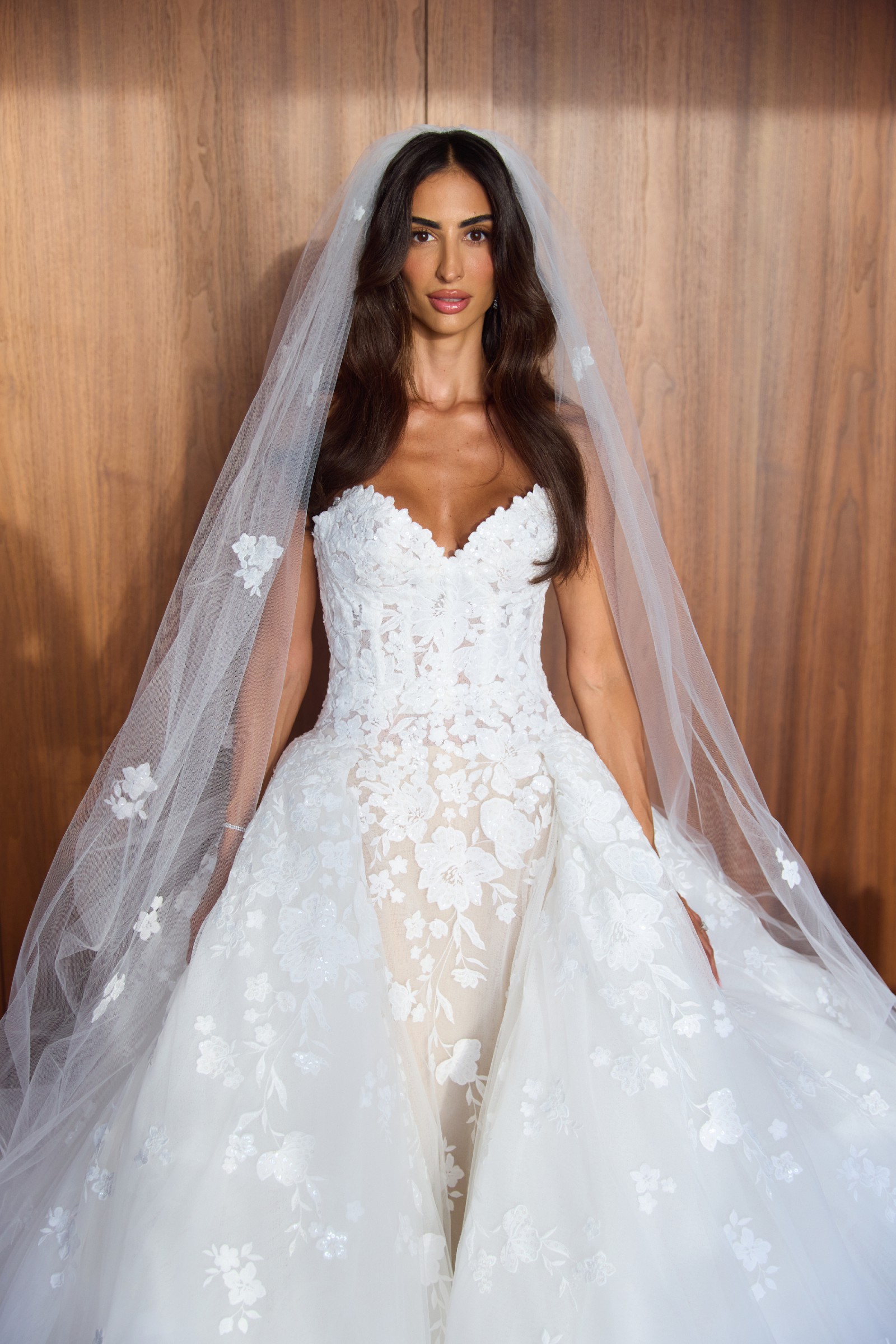 This Zuhair Murad ballgown, flown in from Paris, is truly one of a kind. The strapless sweetheart neckline and low back are timeless, while the gown is covered in delicate 3D flowers, embroidery, and sequins that shimmer beautifully in the light.