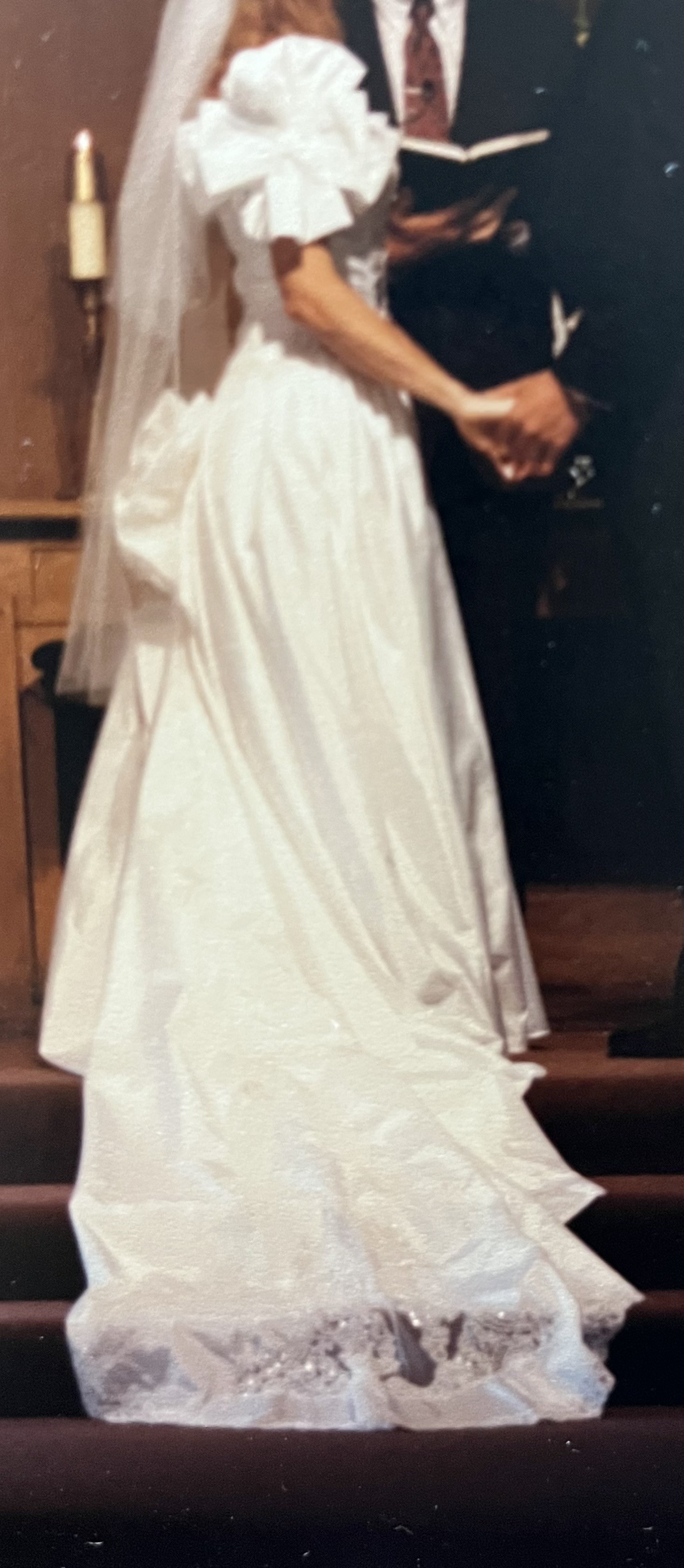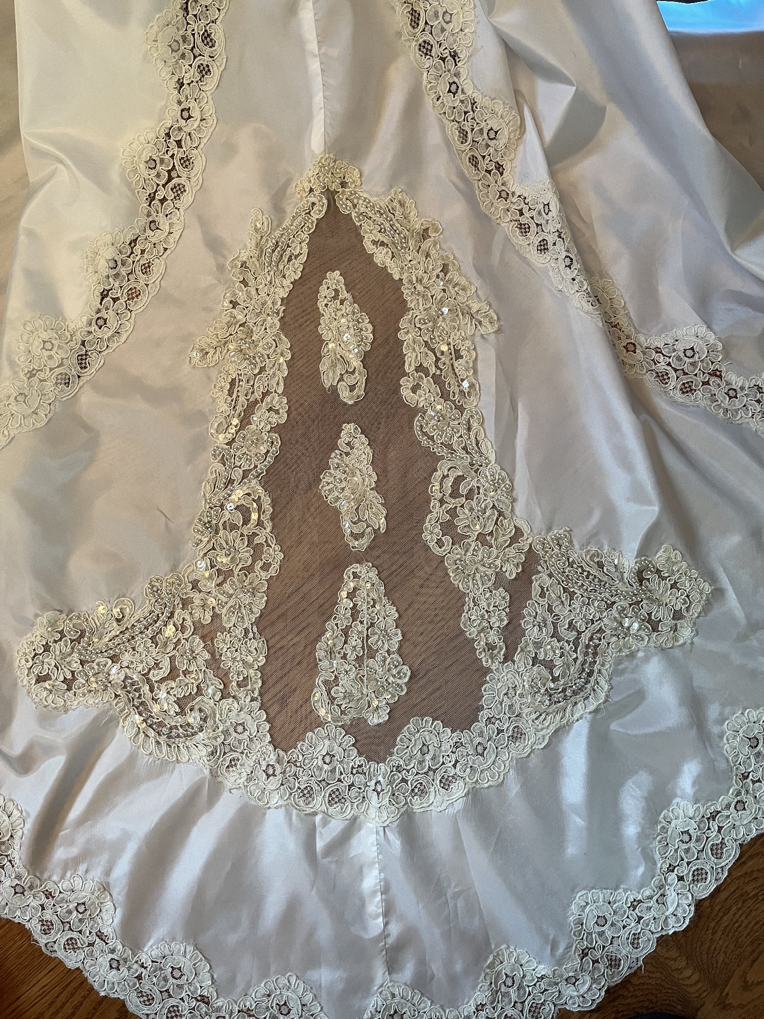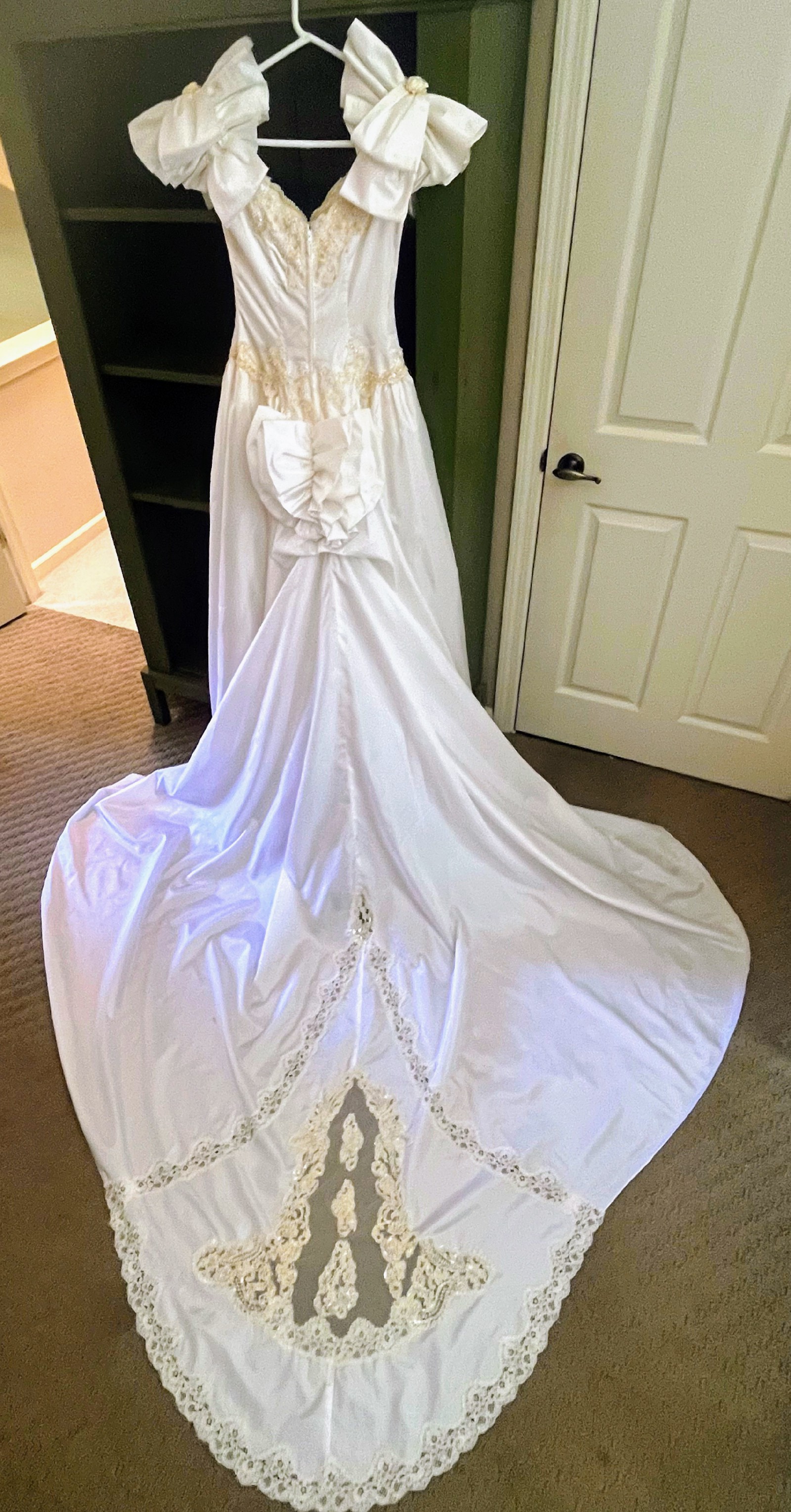Uniquely stunning 1980s vintage gown features heavily beaded bodice, intricate lace work, off-shoulder sleeves, bustle, plus long train with cut-out details. (Sleeves can be worn off or on shoulder.) Material: White satin with lace appliqué and beadwork.