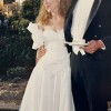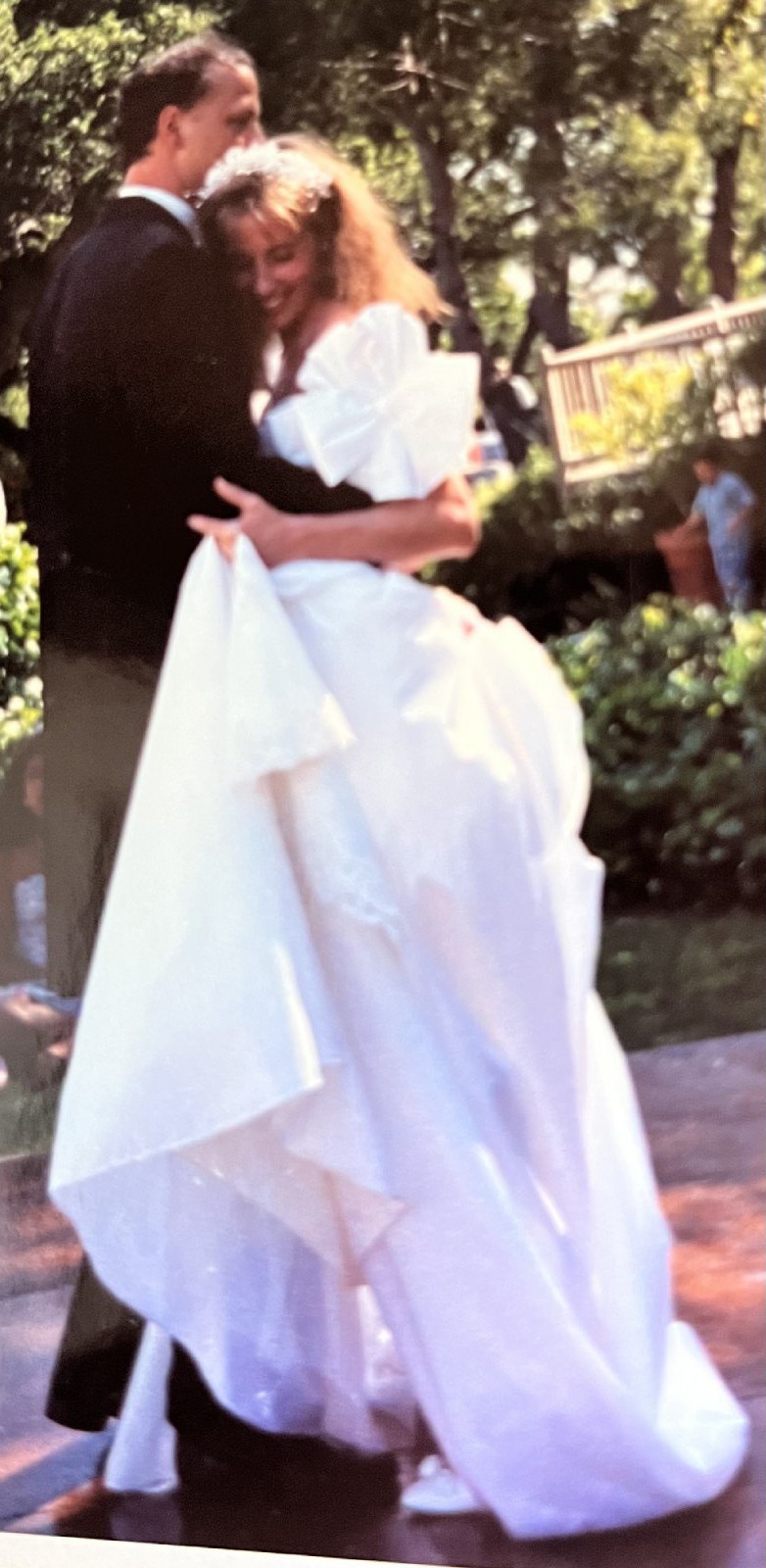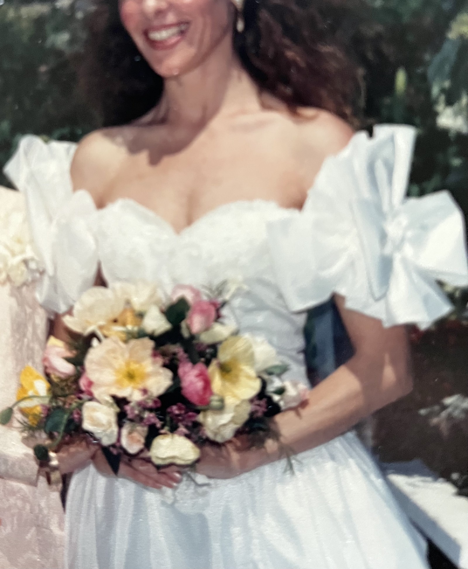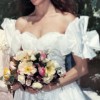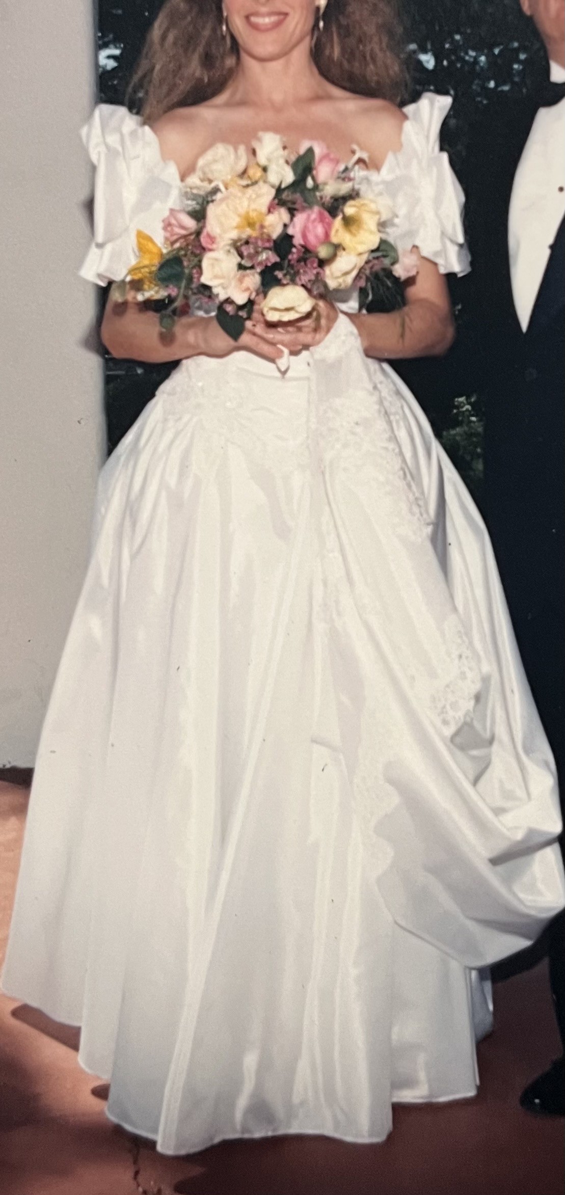 Uniquely stunning 1980s vintage gown features heavily beaded bodice, intricate lace work, off-shoulder sleeves, bustle, plus long train with cut-out details. (Sleeves can be worn off or on shoulder.) Material: White satin with lace appliqué and beadwork.