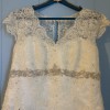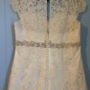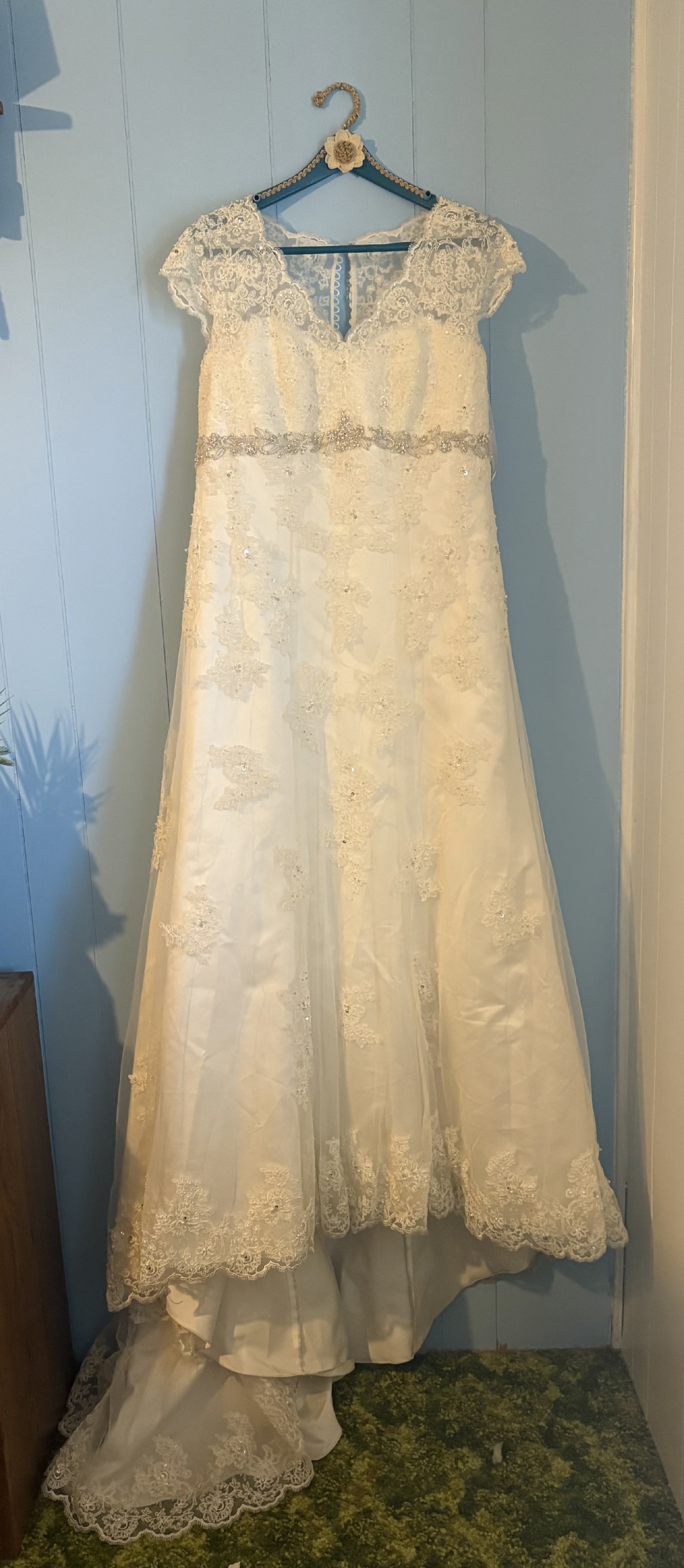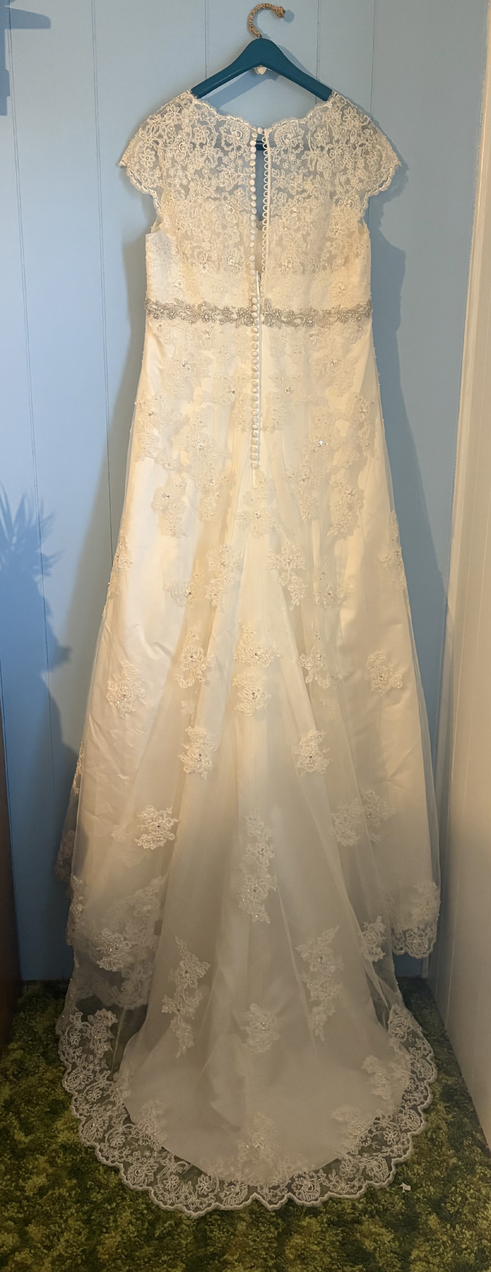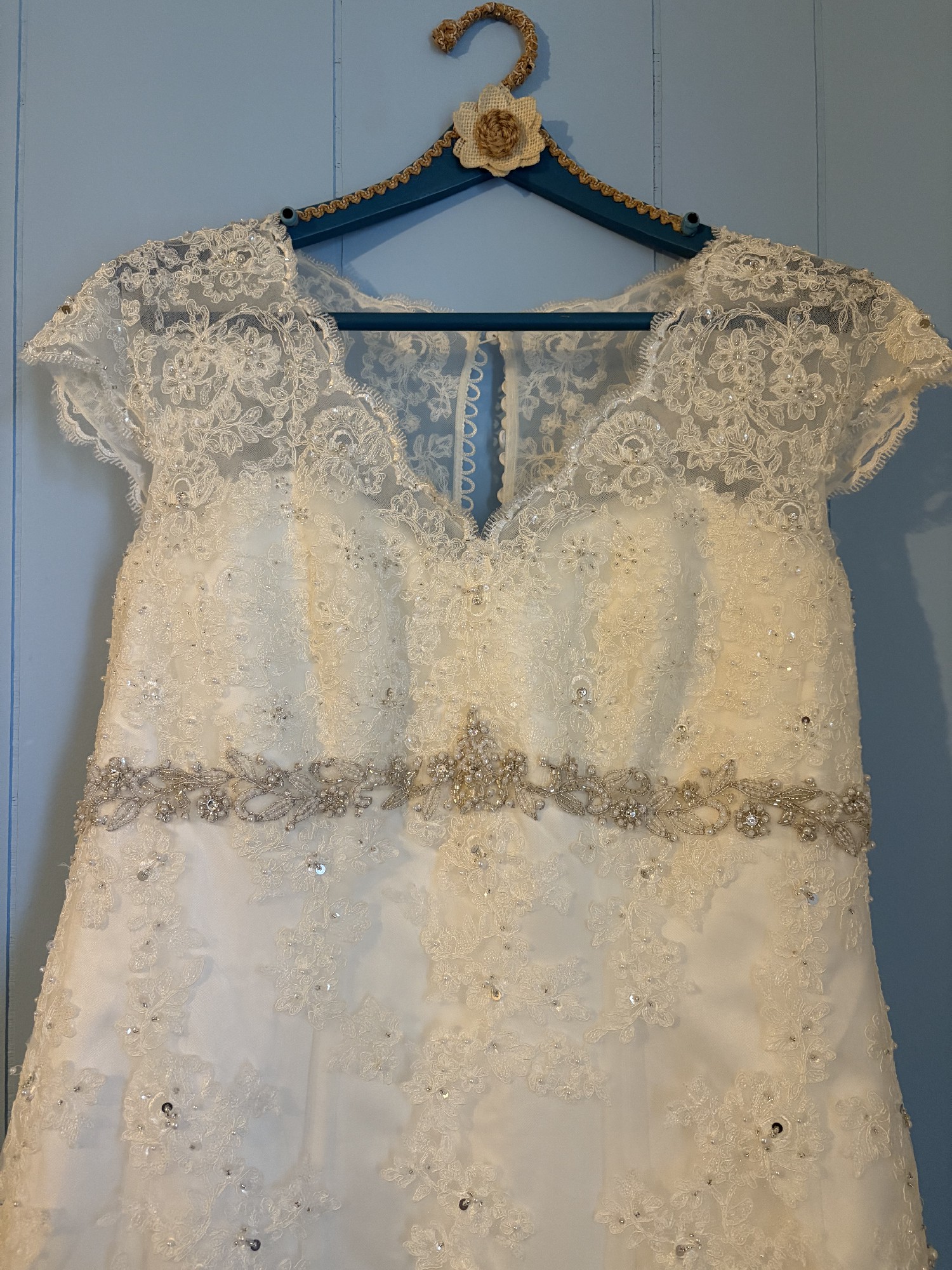This romantic and feminine lace and satin A-line gown combines timeless elegance with intricate detail. The empire waistline is adorned with ornate beading, while the scalloped eyelash-lace cap sleeves and illusion back detail add romantic allure.
