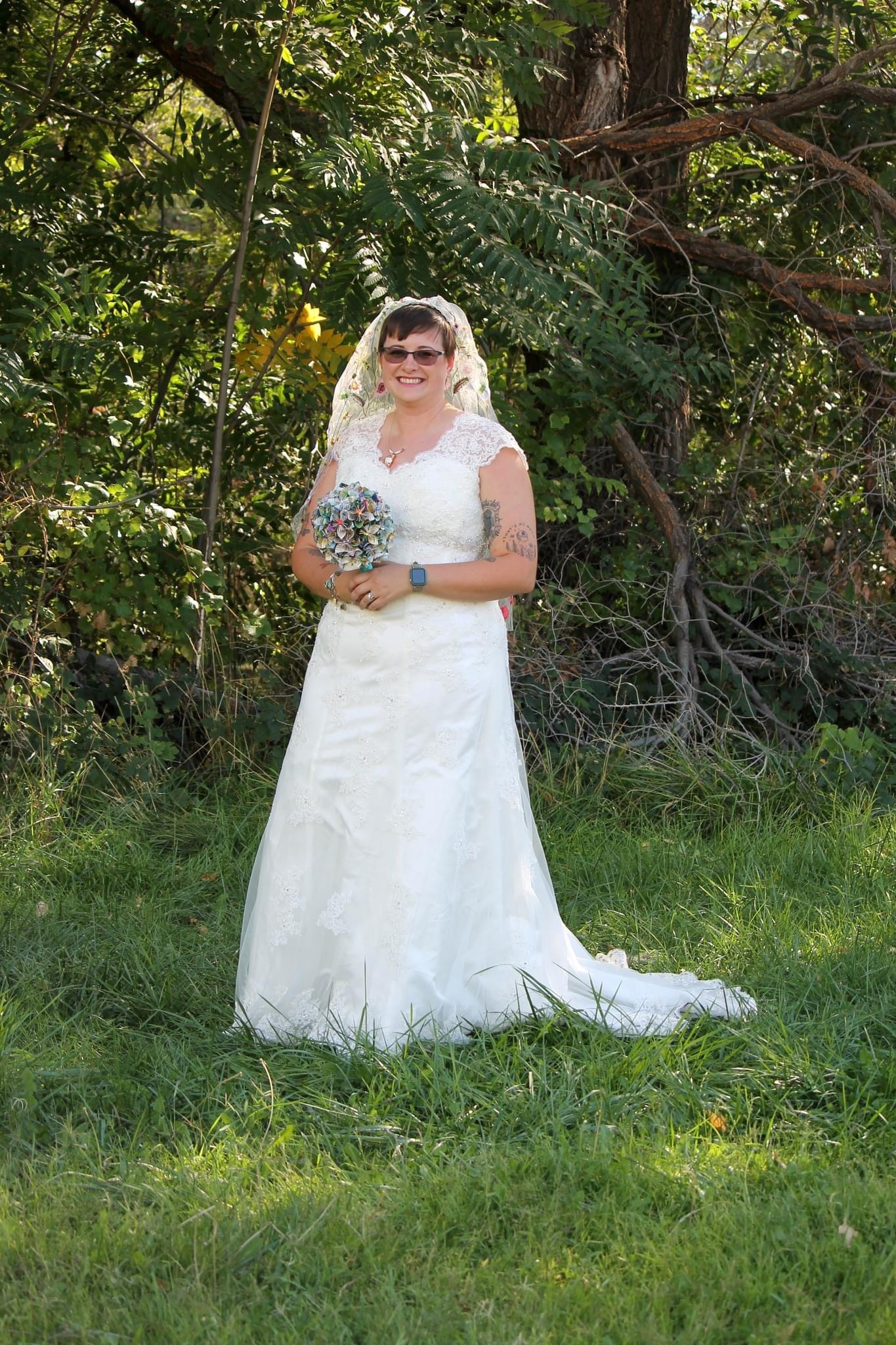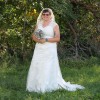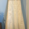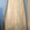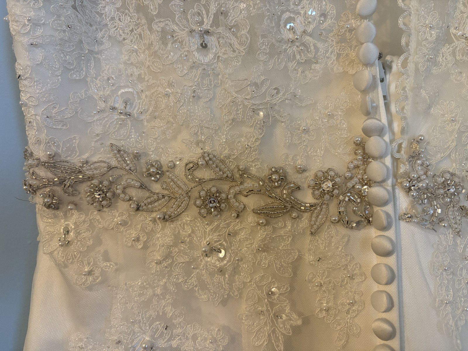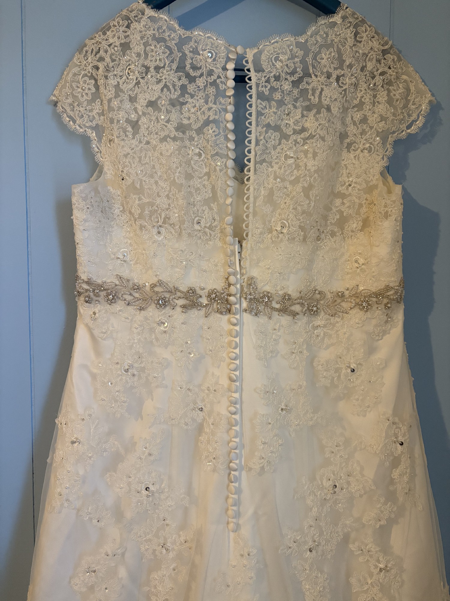 This romantic and feminine lace and satin A-line gown combines timeless elegance with intricate detail. The empire waistline is adorned with ornate beading, while the scalloped eyelash-lace cap sleeves and illusion back detail add romantic allure.